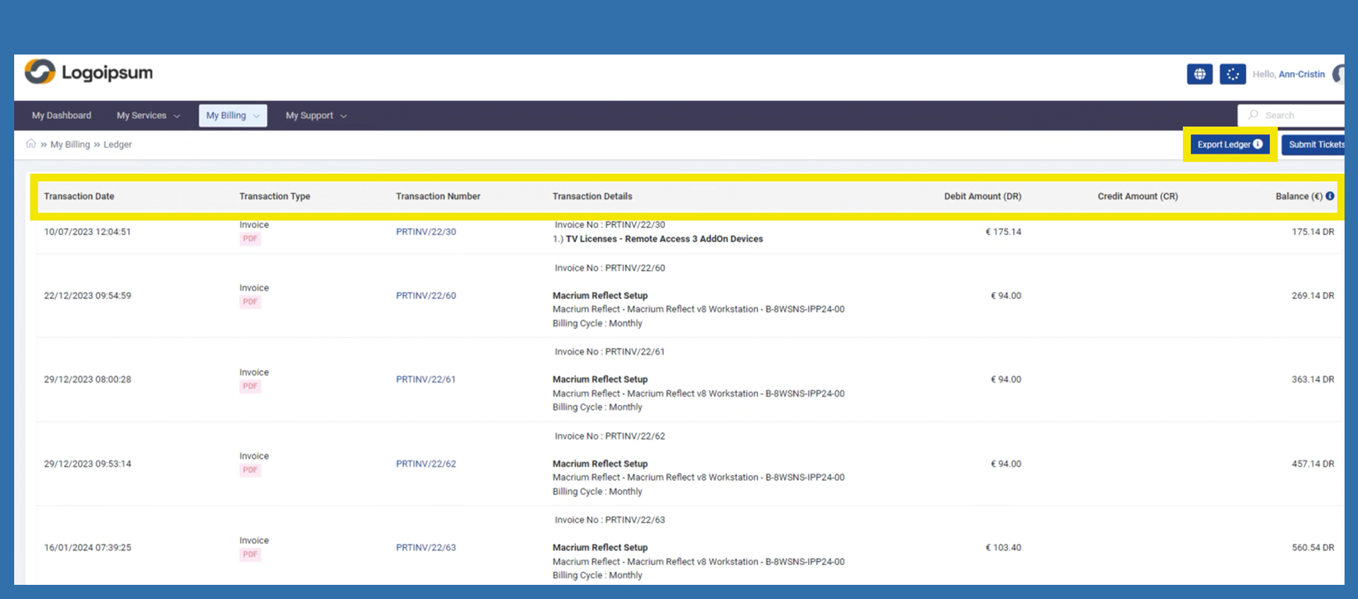 With the Export Ledger button, you can export an excel spreadsheet containing all the information listed here.