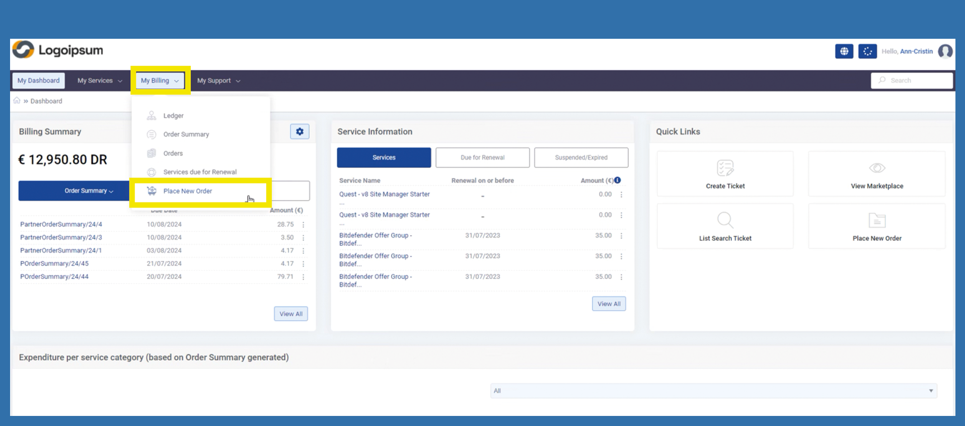 There are several ways for your end customer to create a new order. One of the options is to use the following path: