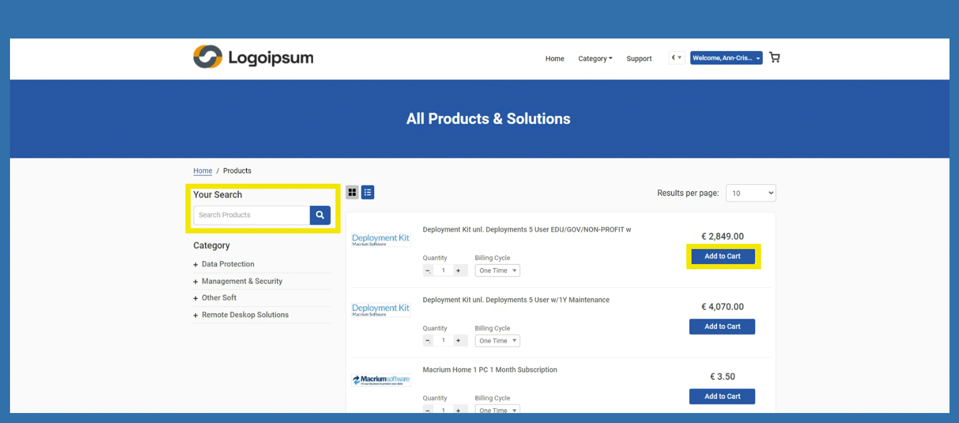 A search function is available on the left-hand side, which can be used by end customer to search for corresponding items.