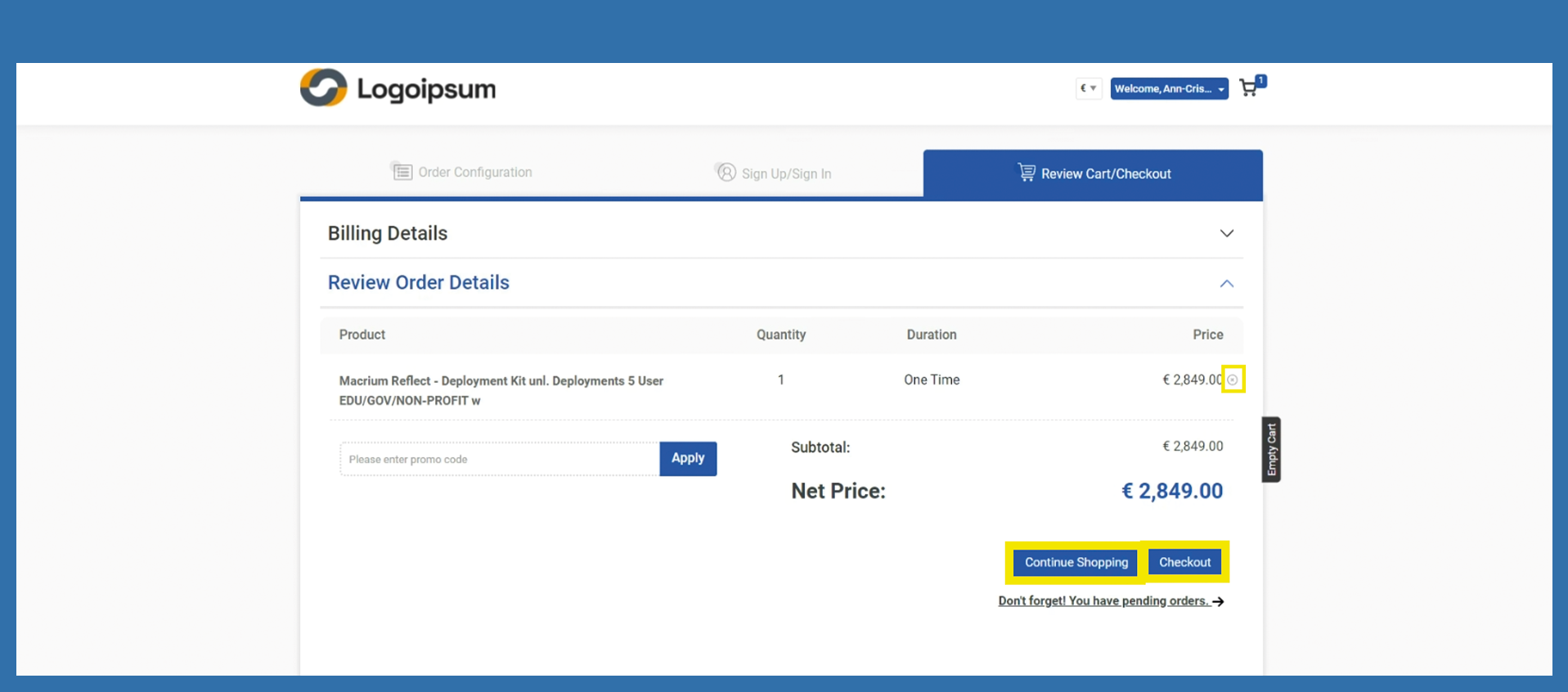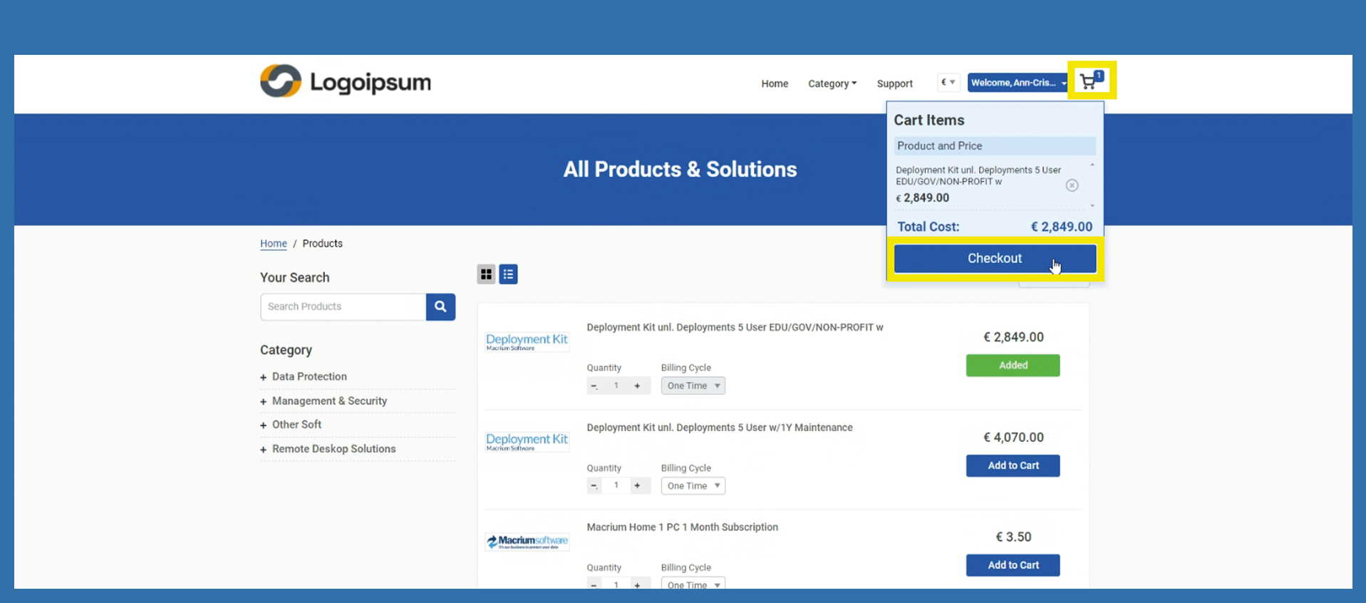 Now end customer must click on the shopping cart at the top right to go to the shopping cart. A popup will open. Previously selected items are displayed. Now end customer must click on Checkout to continue.