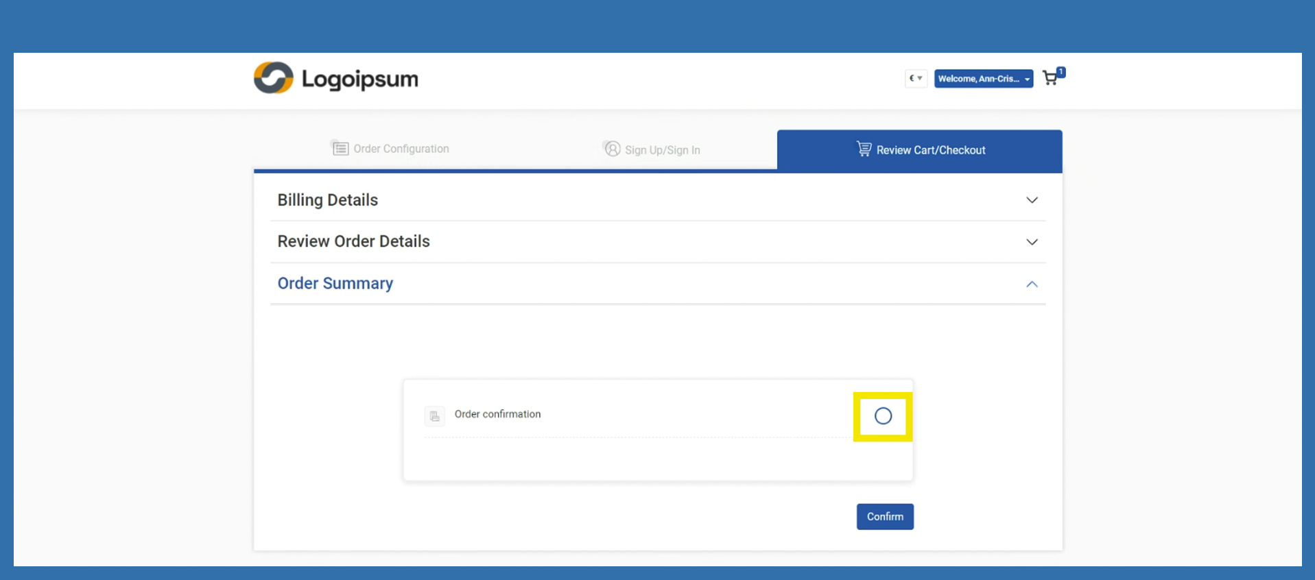 The customer is now in the order summary, which is actually no longer a summary. The customer must select Order Summary again. In the following popup, he must confirm again with Ok. He will then be forwarded automatically.