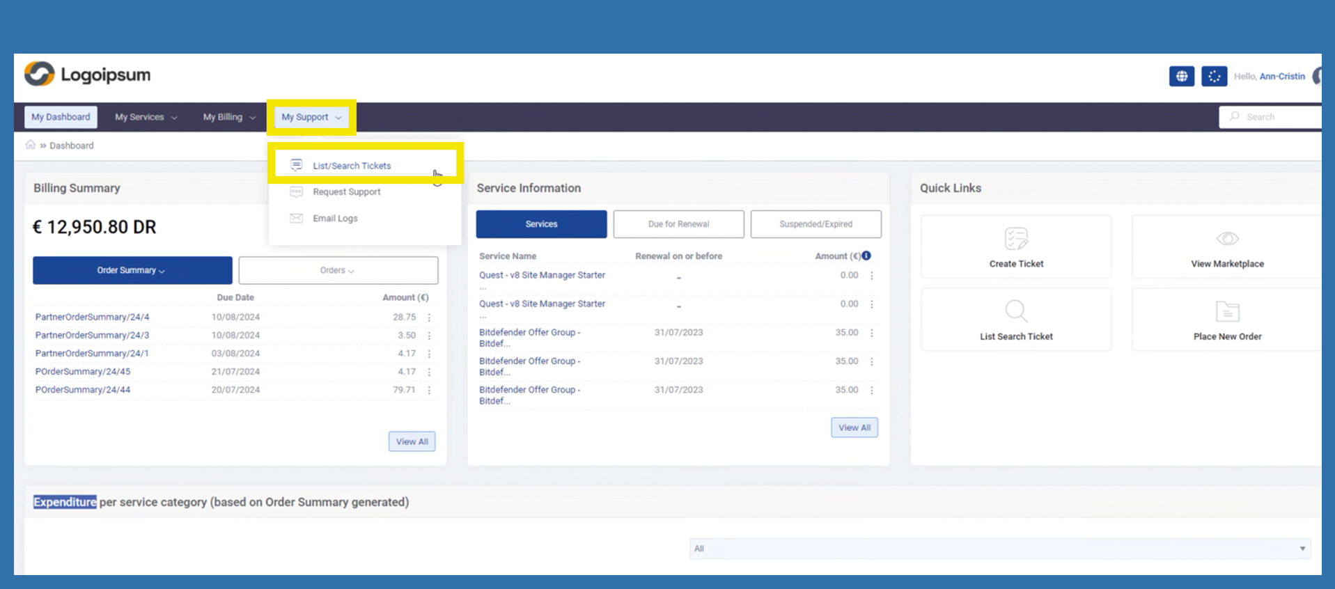If your end customer would like to see which tickets have already been created by him or which tickets have been created in general, he can use the following path to view them.