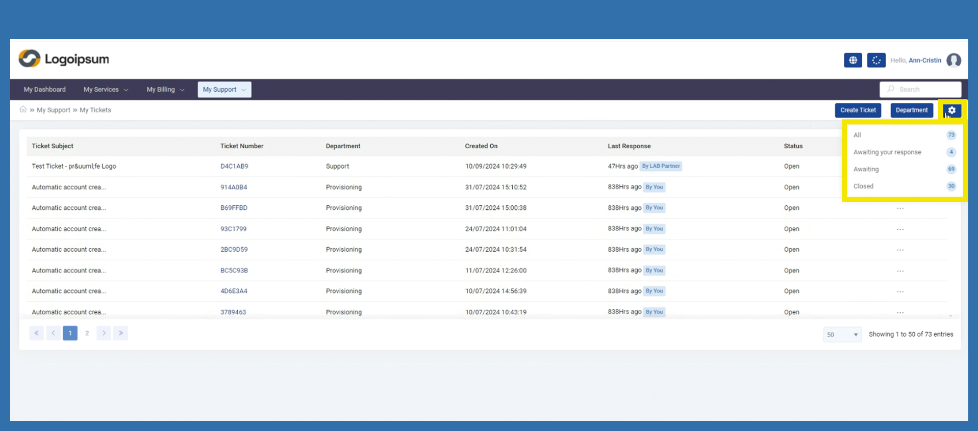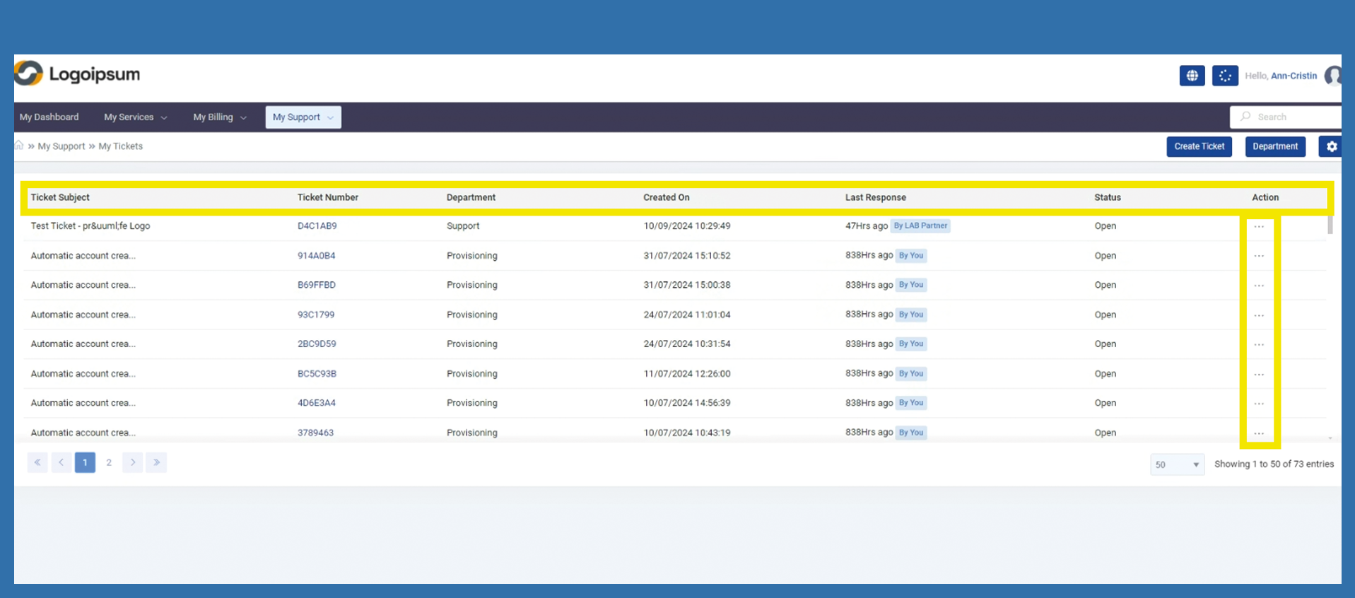 Action: Under Action, the end customer can select the following actions by clicking on the three dots for the respective ticket. See latest response or close ticket