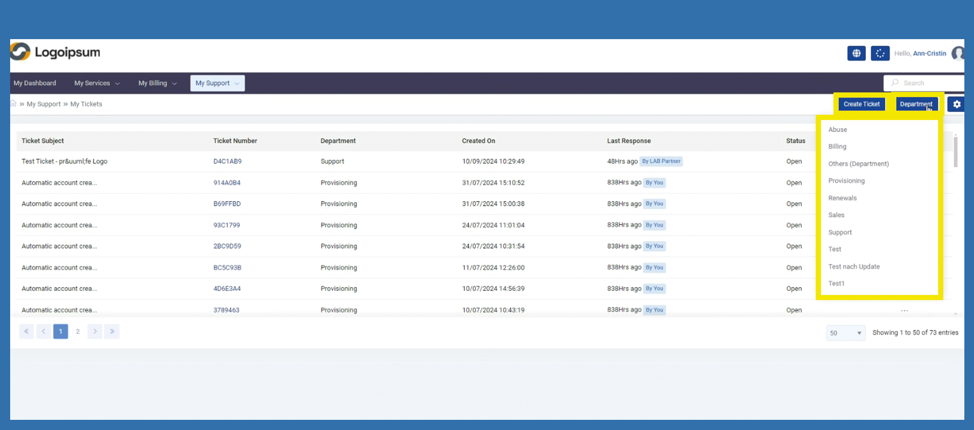 At the top right, the end customer will find further functions, such as Create Ticket. By clicking on this button, they are immediately redirected to the corresponding page.