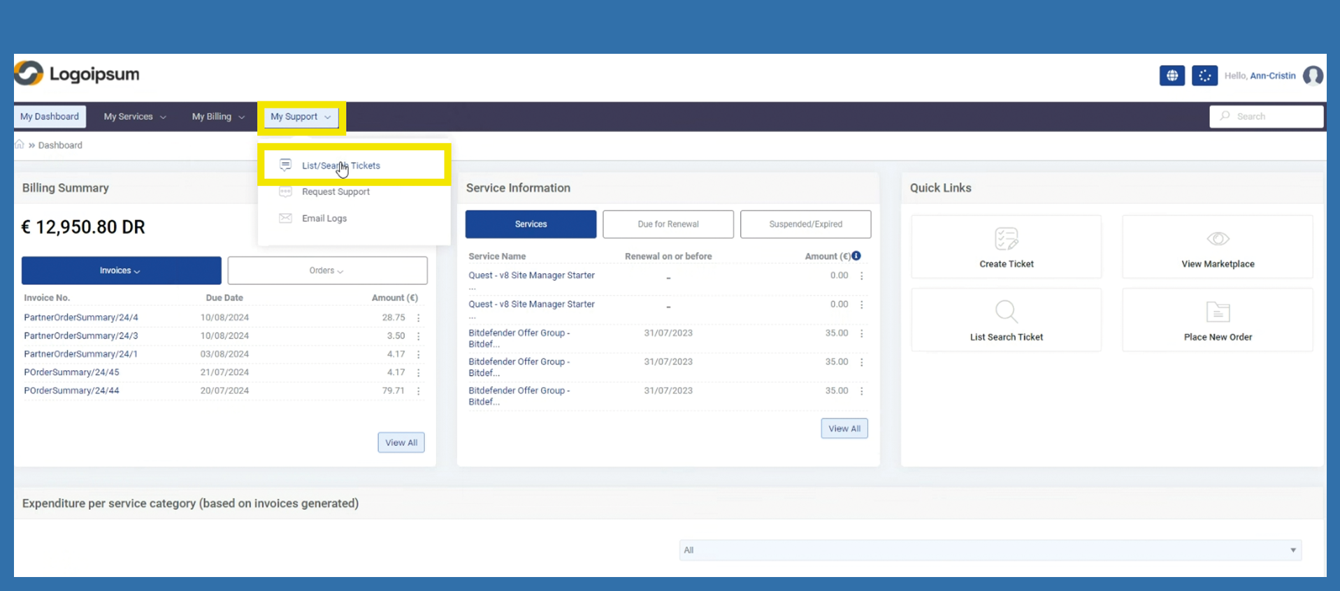 If your end customer would like to see which tickets have already been created by him or which tickets have been created in general, he can use the following path to view them.