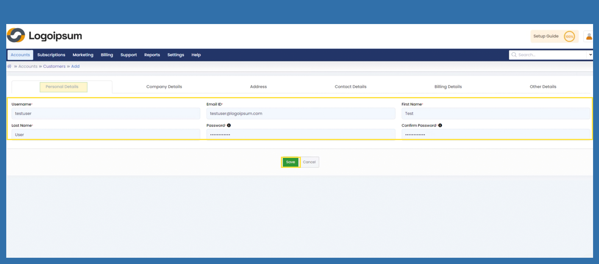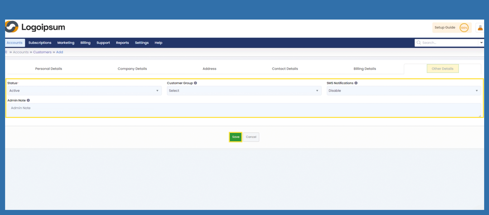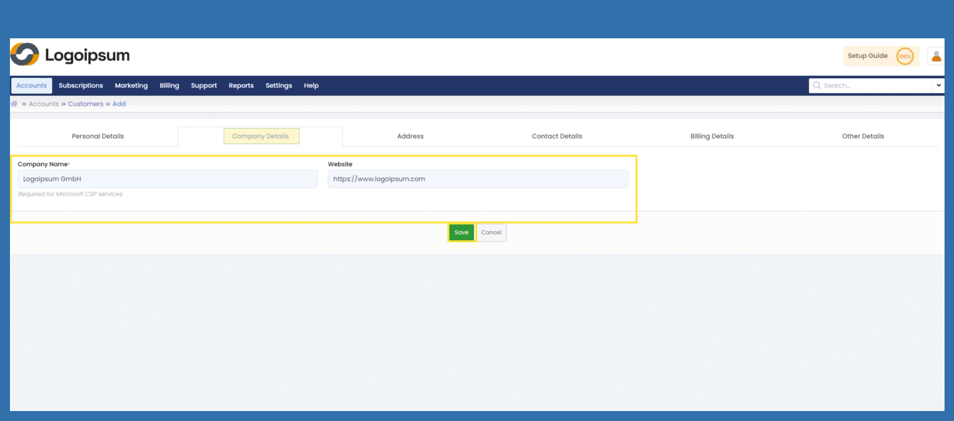 Accounts > Customers > Add
