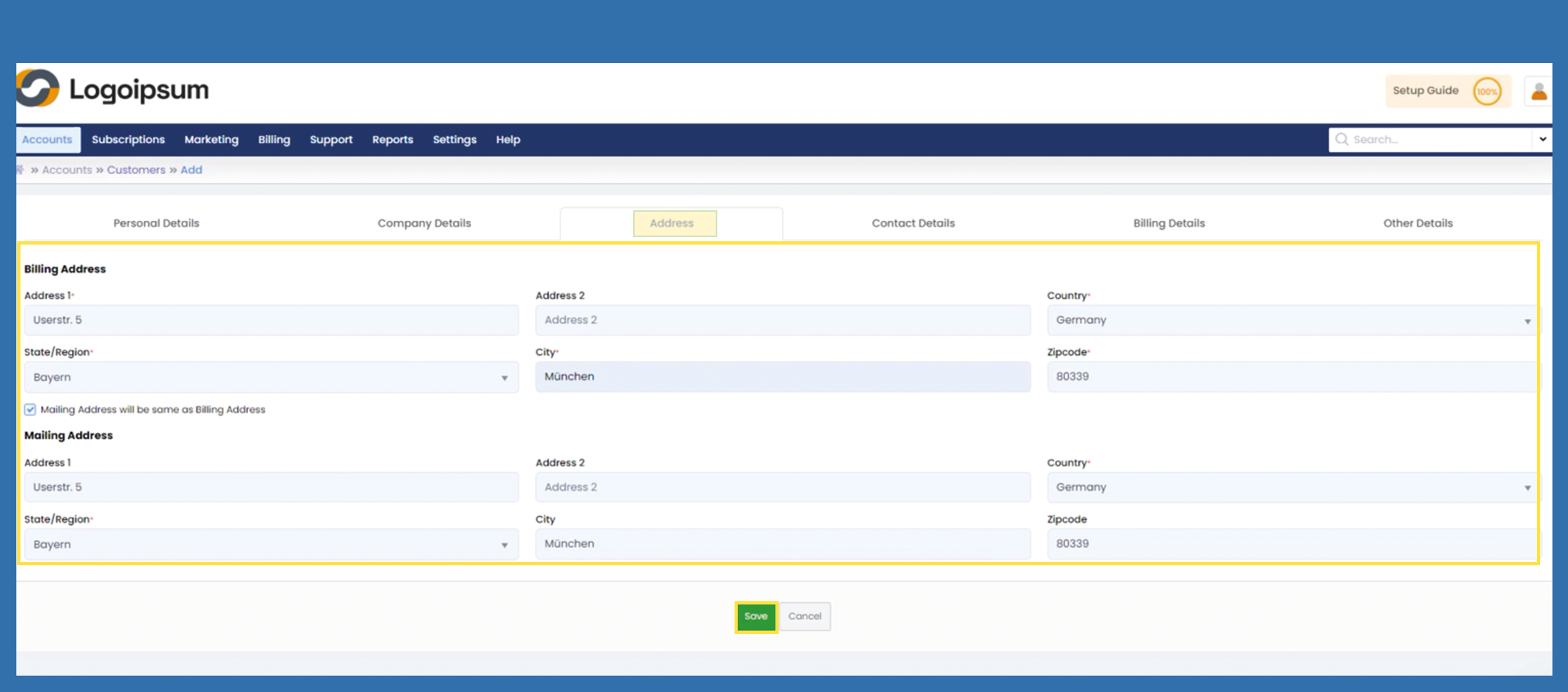 Enter the address of the company and check the box Mailing Address will be same as Billing Address. Check the box so that you do not have to fill in the mailing address. Click on Save.