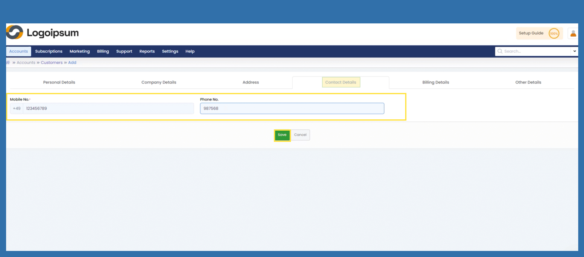 Enter the Mobile No. in the Tab Contact Details. Click on Save.