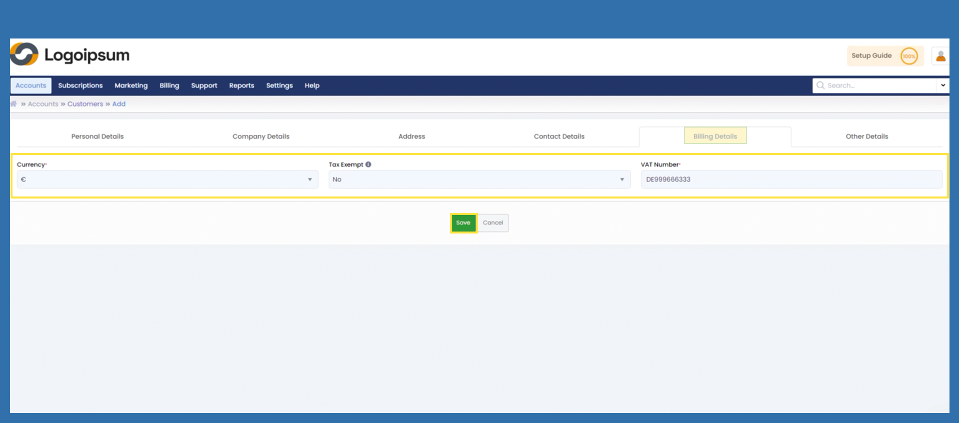 Select the currency with which the customer is charged and fill in the VAT number. Click on Save.