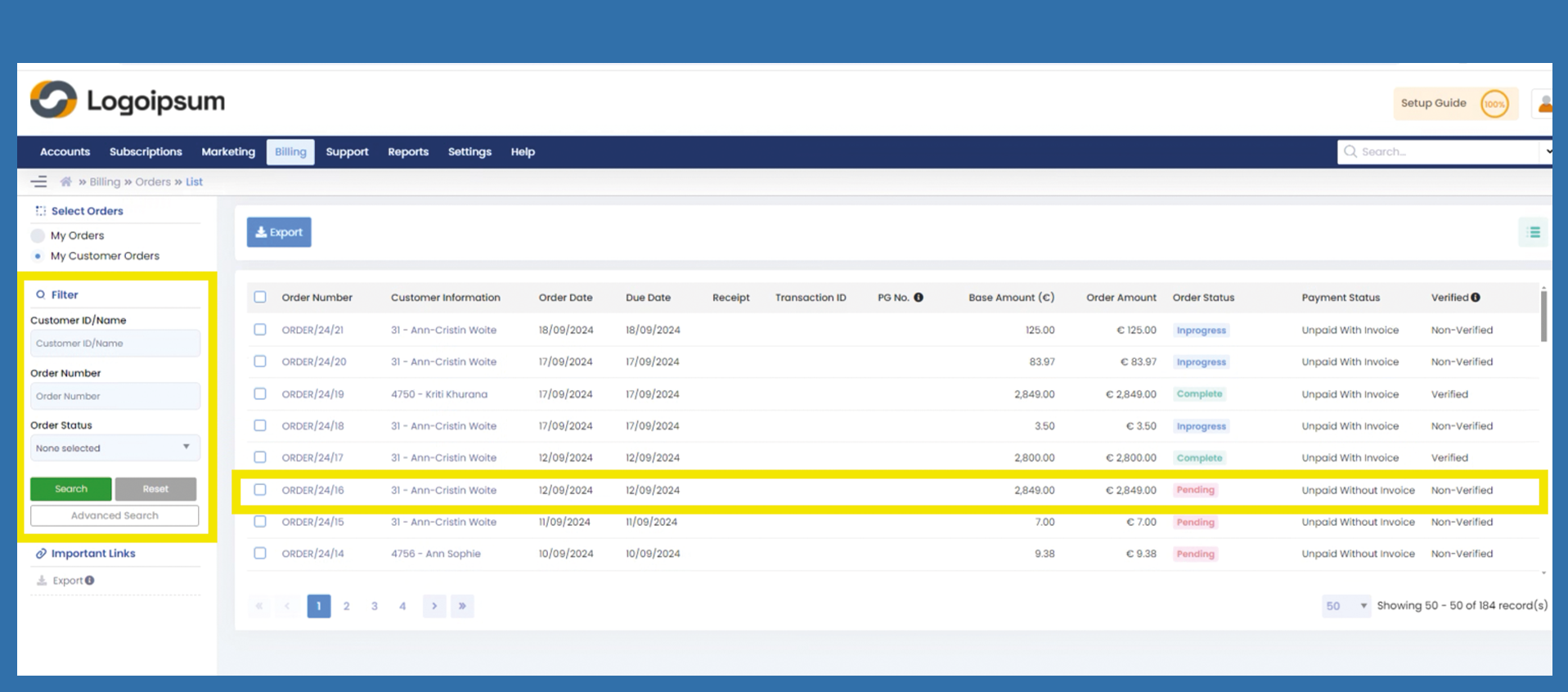 Search for the corresponding order for which changes are to be made. Use the filter function on the left-hand side.