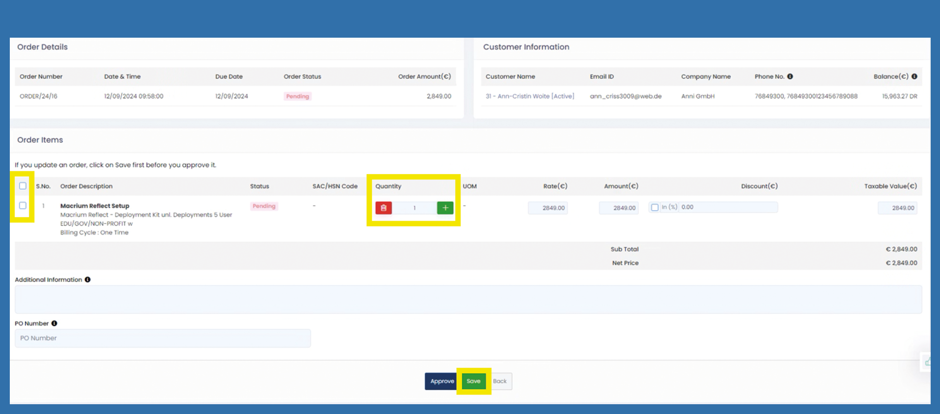 If you want to increase the quantity, click on the plus right next to the quantity in the Quantity area. If you want to reduce the number, you can click on the trash can to the left of the number. You must then select the item by ticking the box in front of the item description and then click Save. The changes are then visible in the end customer portal.