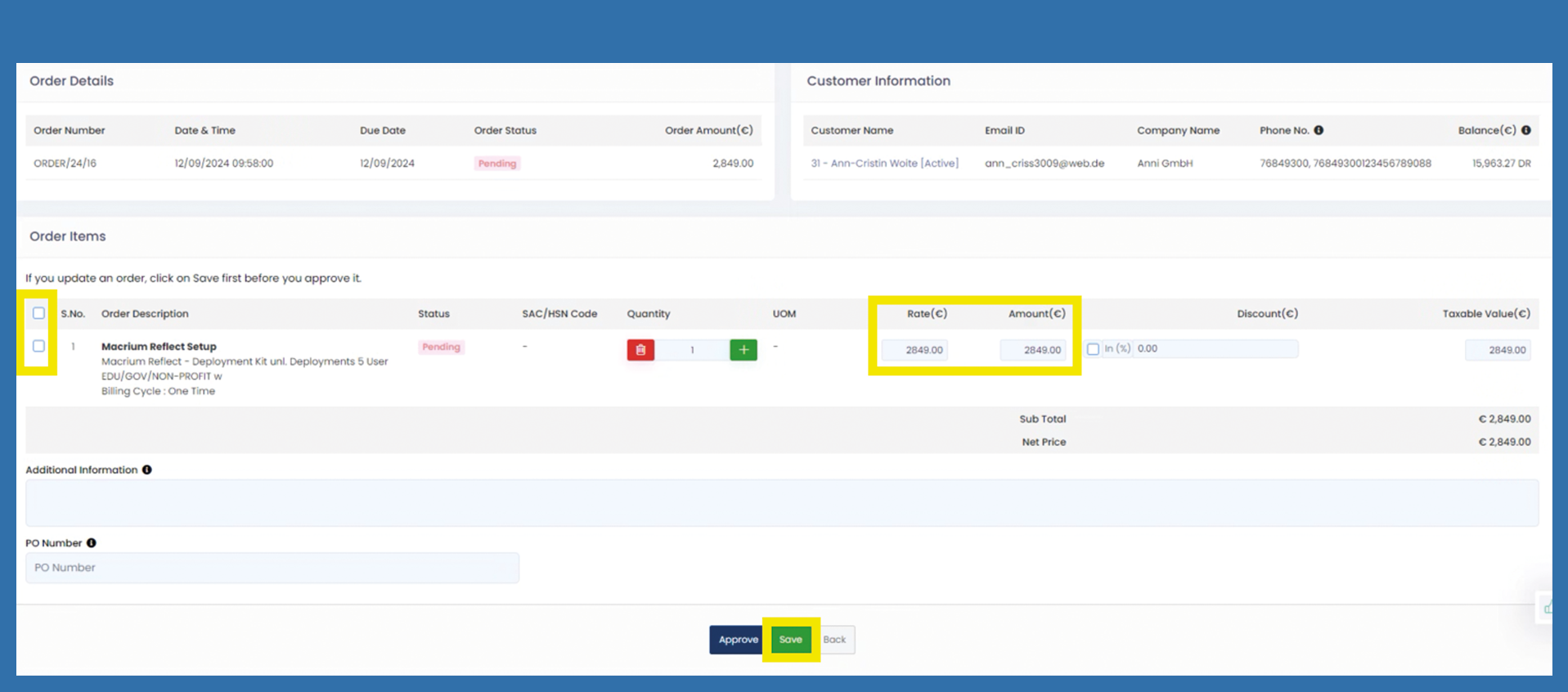 Both the unit price in the Rate field and the total amount in the Amount field can still be changed manually. Enter the corresponding value. If you only enter the unit price, the total amount changes. If you change the total amount, the unit price will also be adjusted. You must then select the item by ticking the box in front of the item description and then click Save. The changes are then visible in the end customer portal.