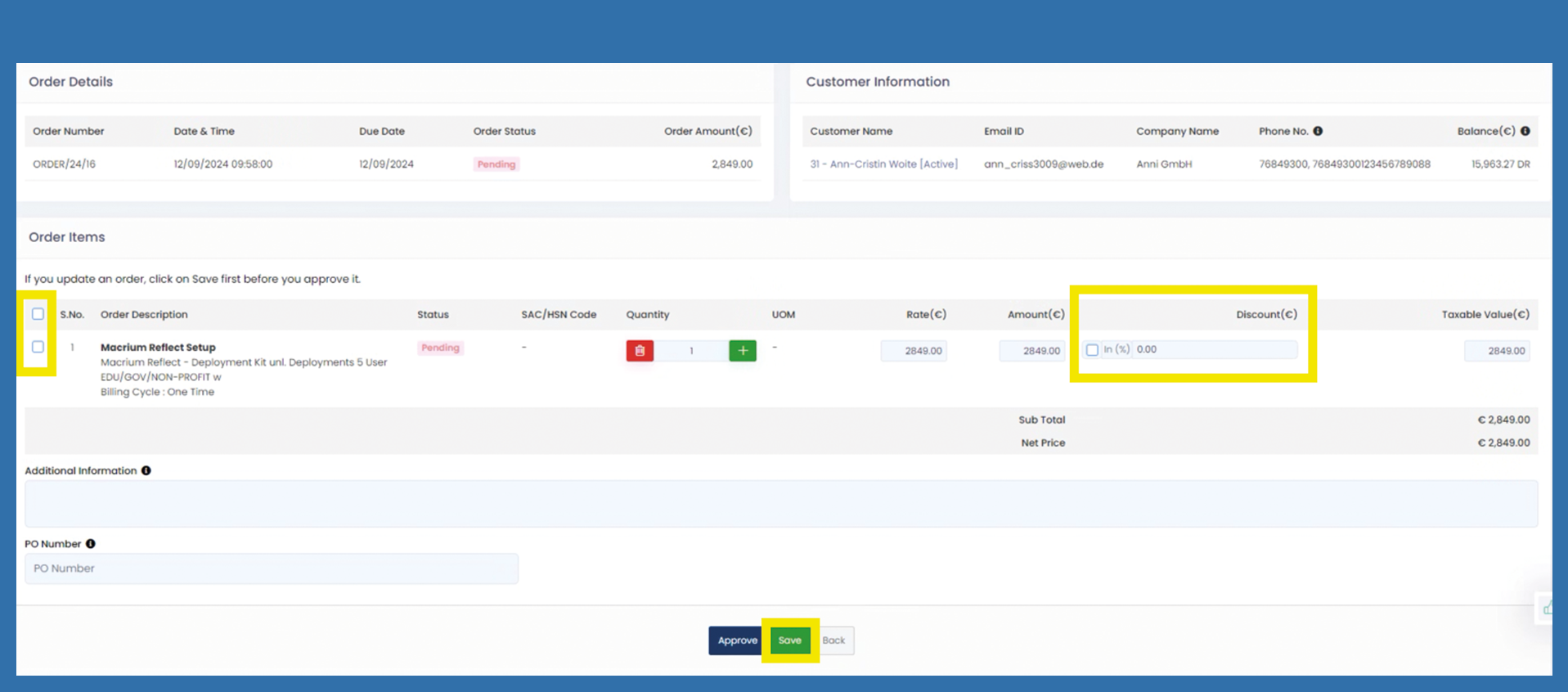 To grant a discount in the amount of a percentage, you can place a check mark in front of the % sign in the Discount (€) field. Otherwise, you can simply enter an amount to be deducted in the writeable field. You must then select the item by ticking the box in front of the item description and then click Save. The changes are then visible in the end customer portal.