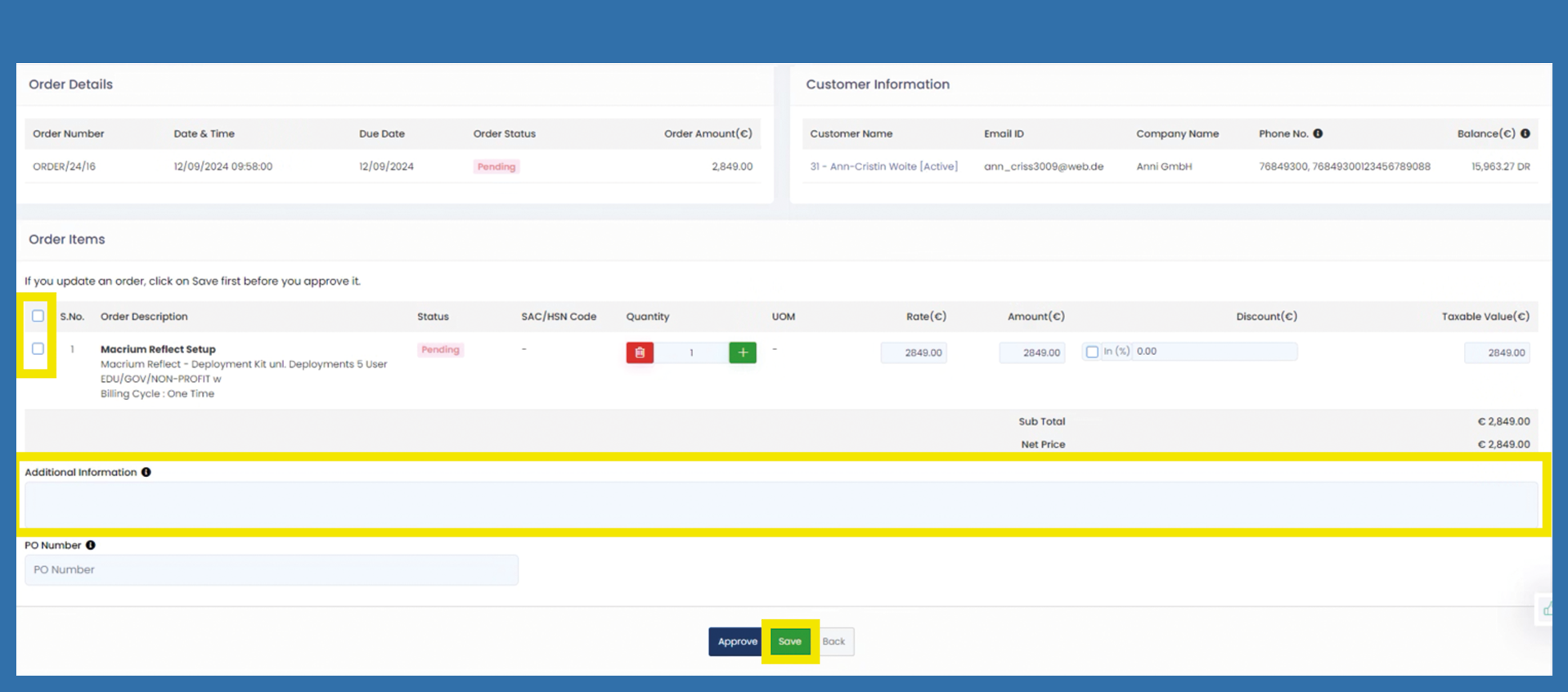 If you would like to add a comment to the order, you can do so in the Additional Information field. You must then select the item by ticking the box in front of the item description and then click Save.