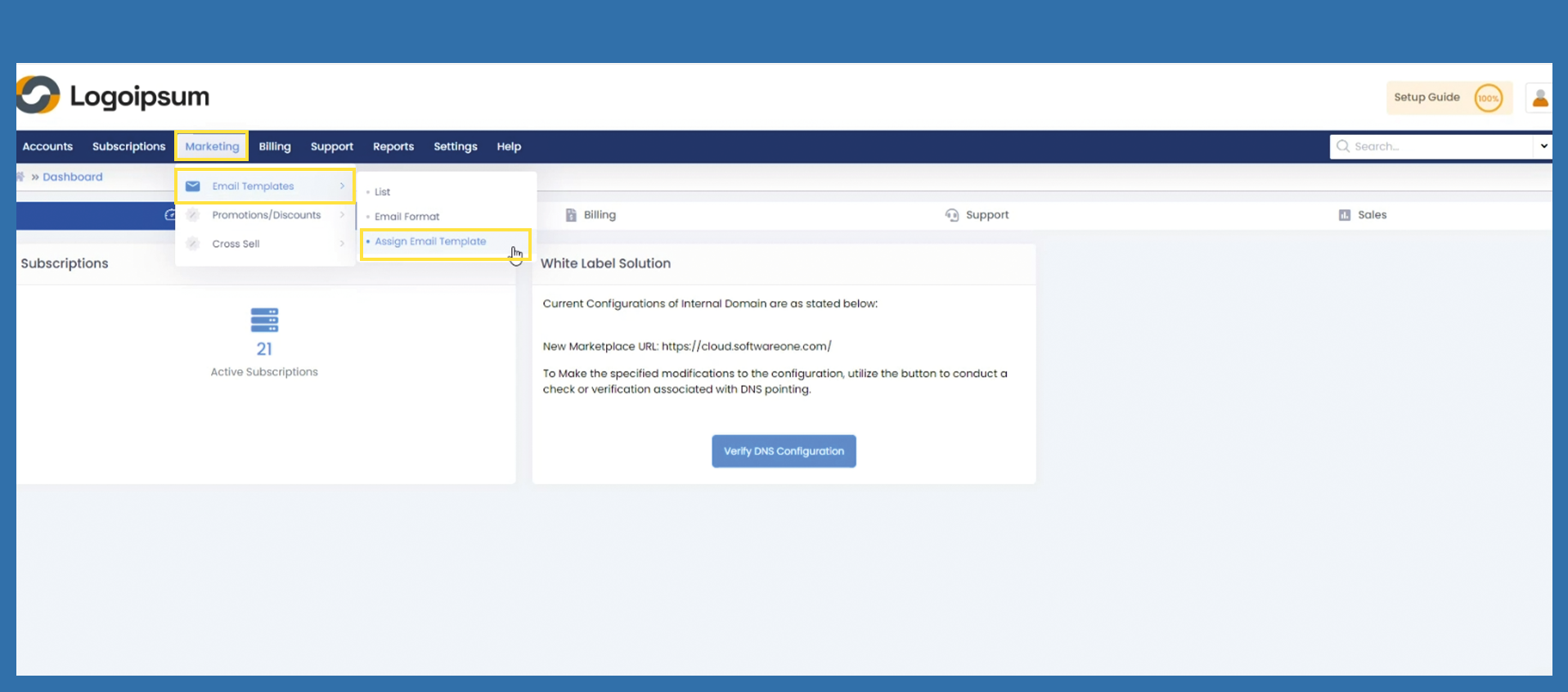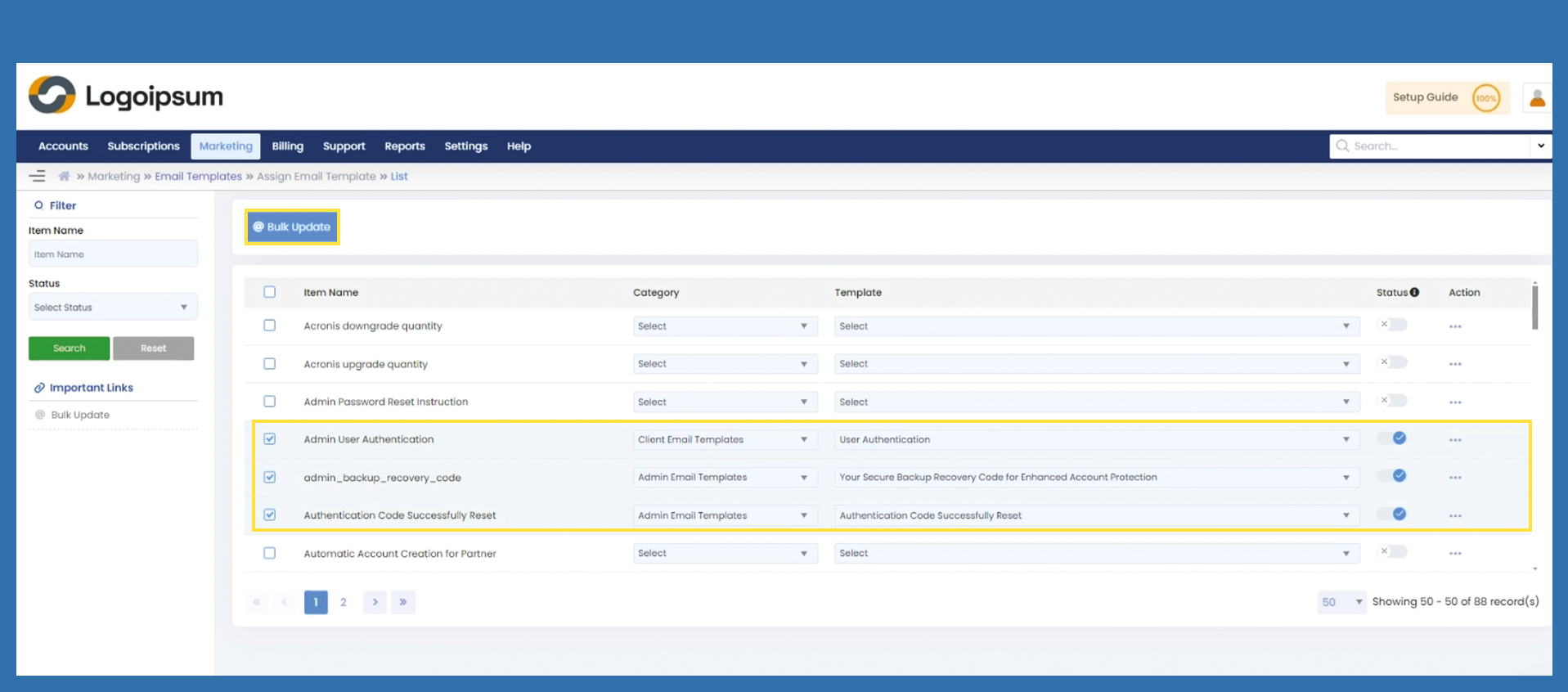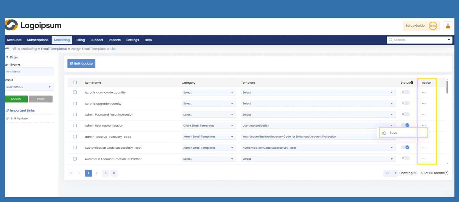 The Assign Email Templates function is used to assign previously created email templates to a specific process.