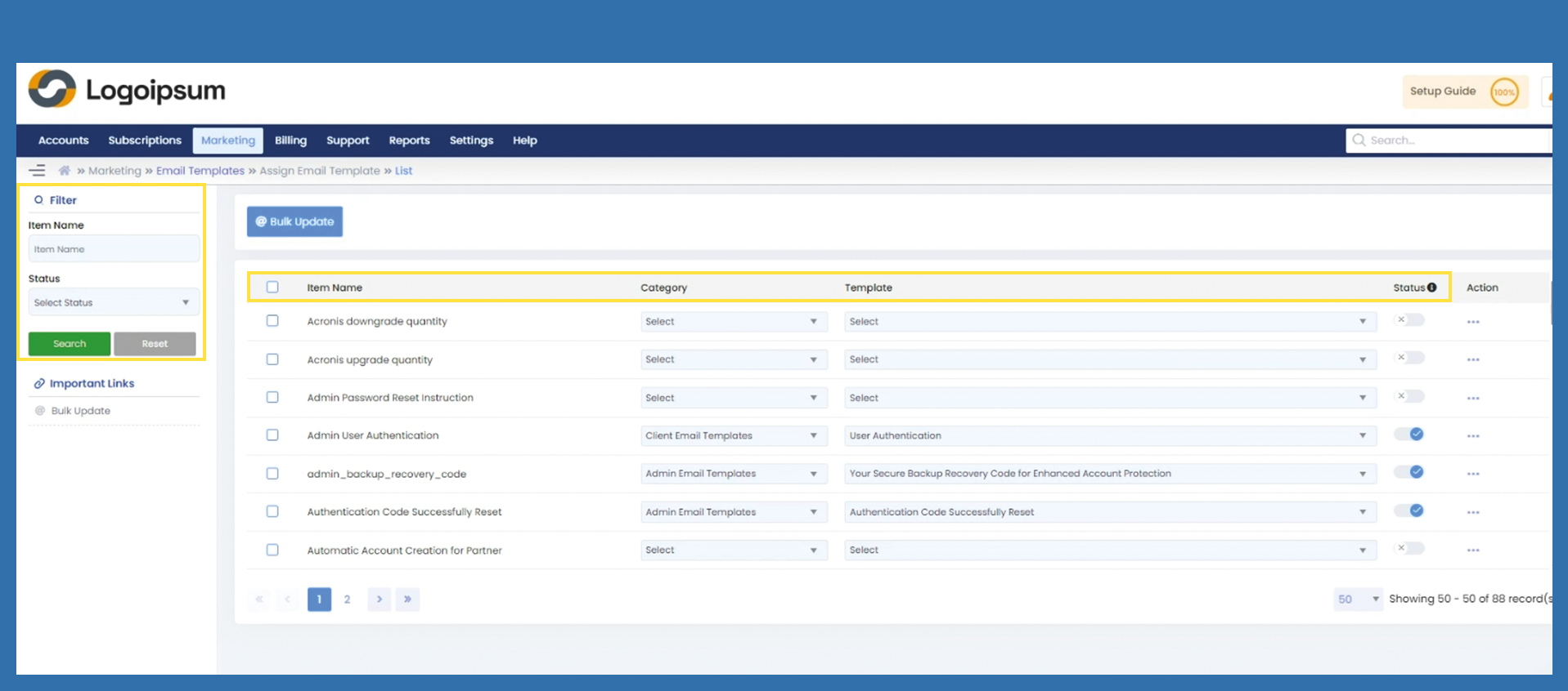 Status: If an X is displayd, this Email Template is inactive. If a blue slider is displayd, the Email Template is active.