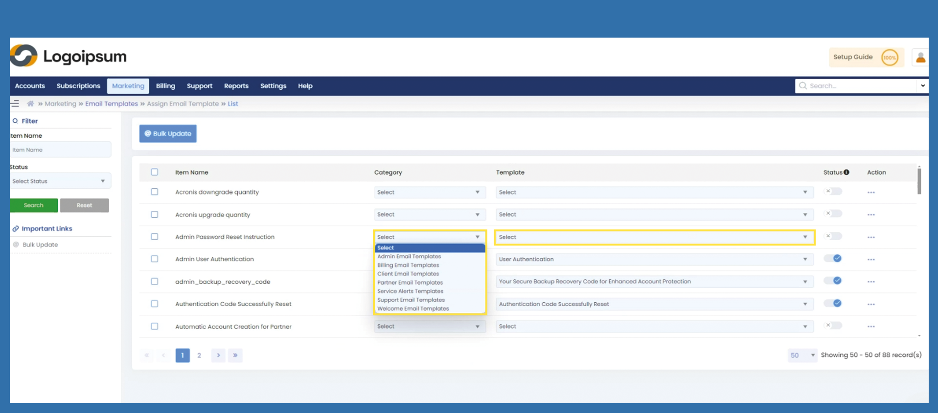 To change an existing setting for a category or template, select the desired dropdown for the process.