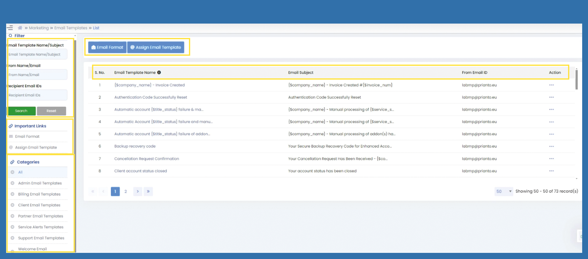 Categories: Quick access to different subject areas. All e-mail templates are divided into different categories here.