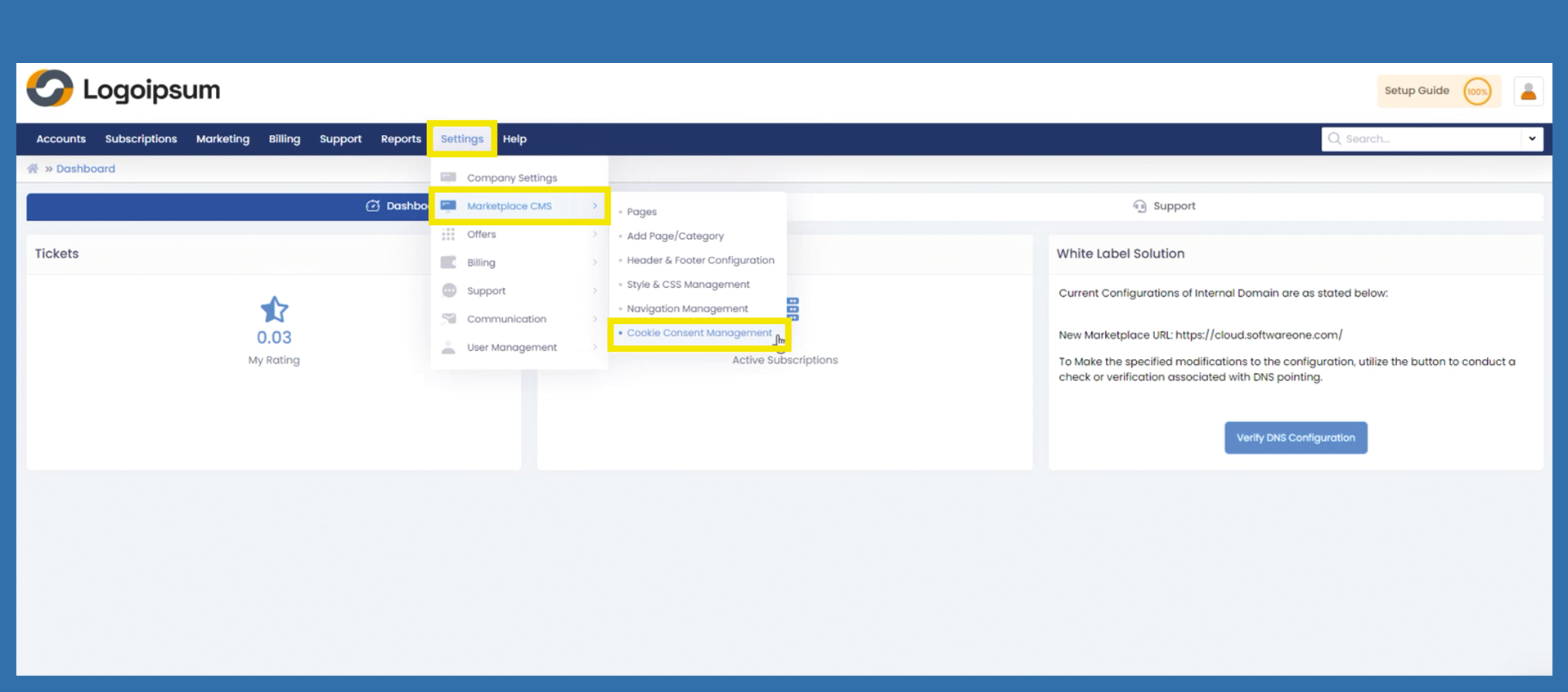 Under Enable Cookie Message on Marketplace you can Enable or Disable via dropdown the hole cookie banner from your website.