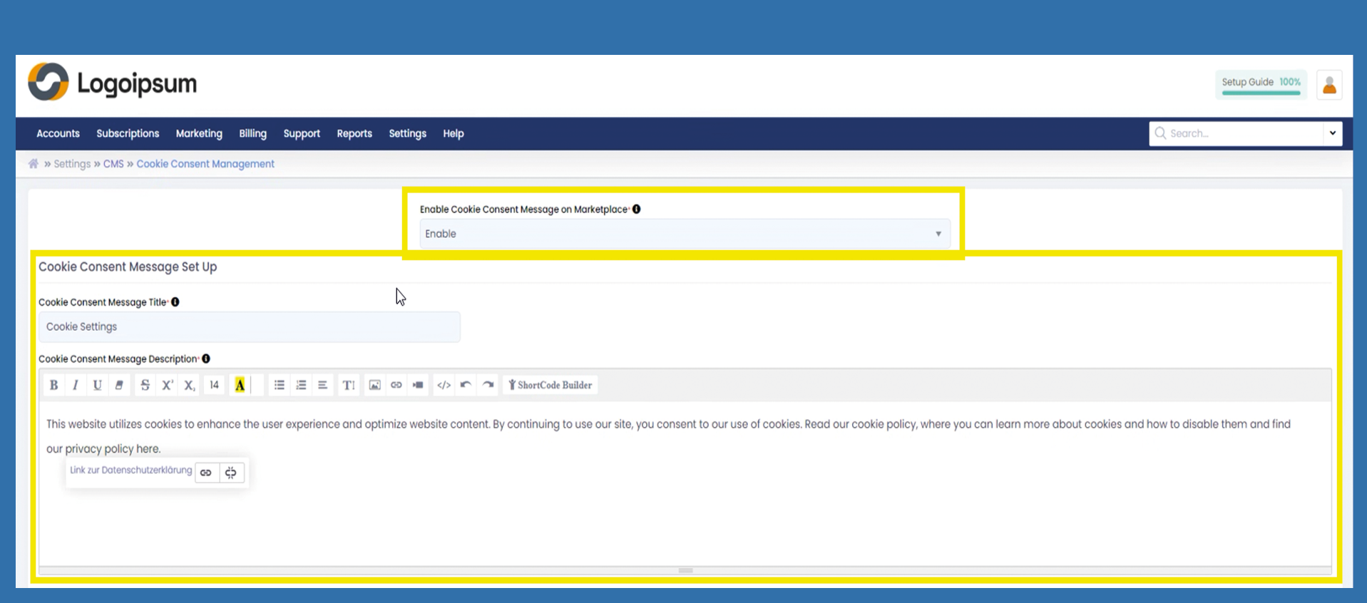Cookie Consent Message Description: You can edit the preliminary description that is displayed in the pop-up window. To do this, click in the text field and adjust the text according to your wishes.