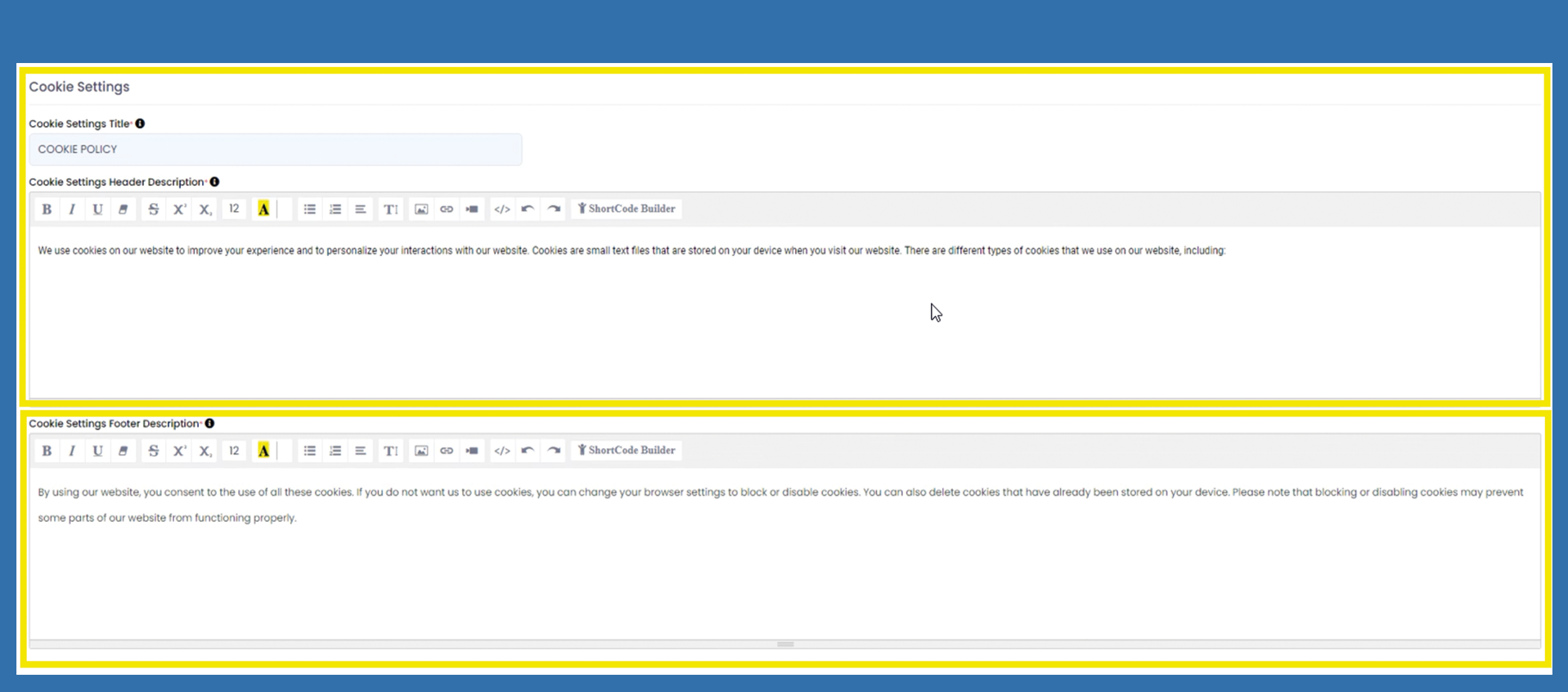 Cookie Settings Title is displayed as a heading in the cookie settings.