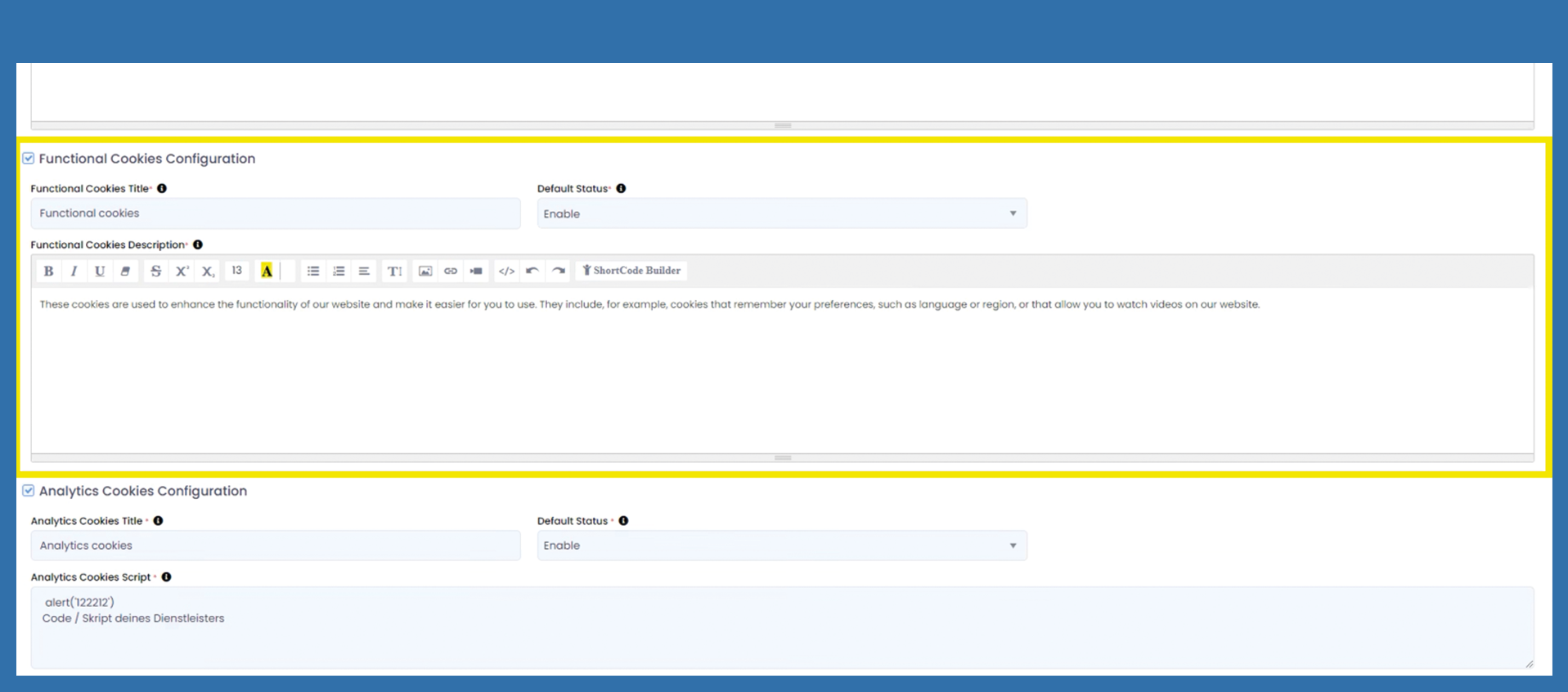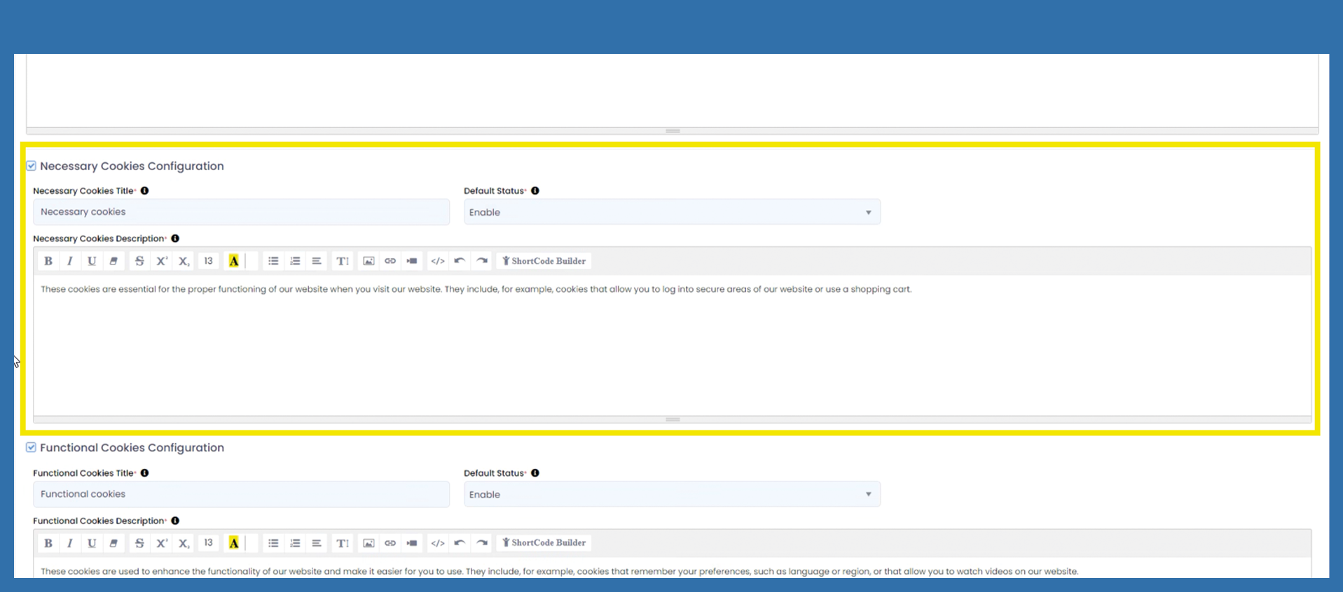 Choose the Default Status to Enable or Disable this area in the cookie banner via dropdown. The descriptive text for functional cookies can be customized under Functional Cookies Description.