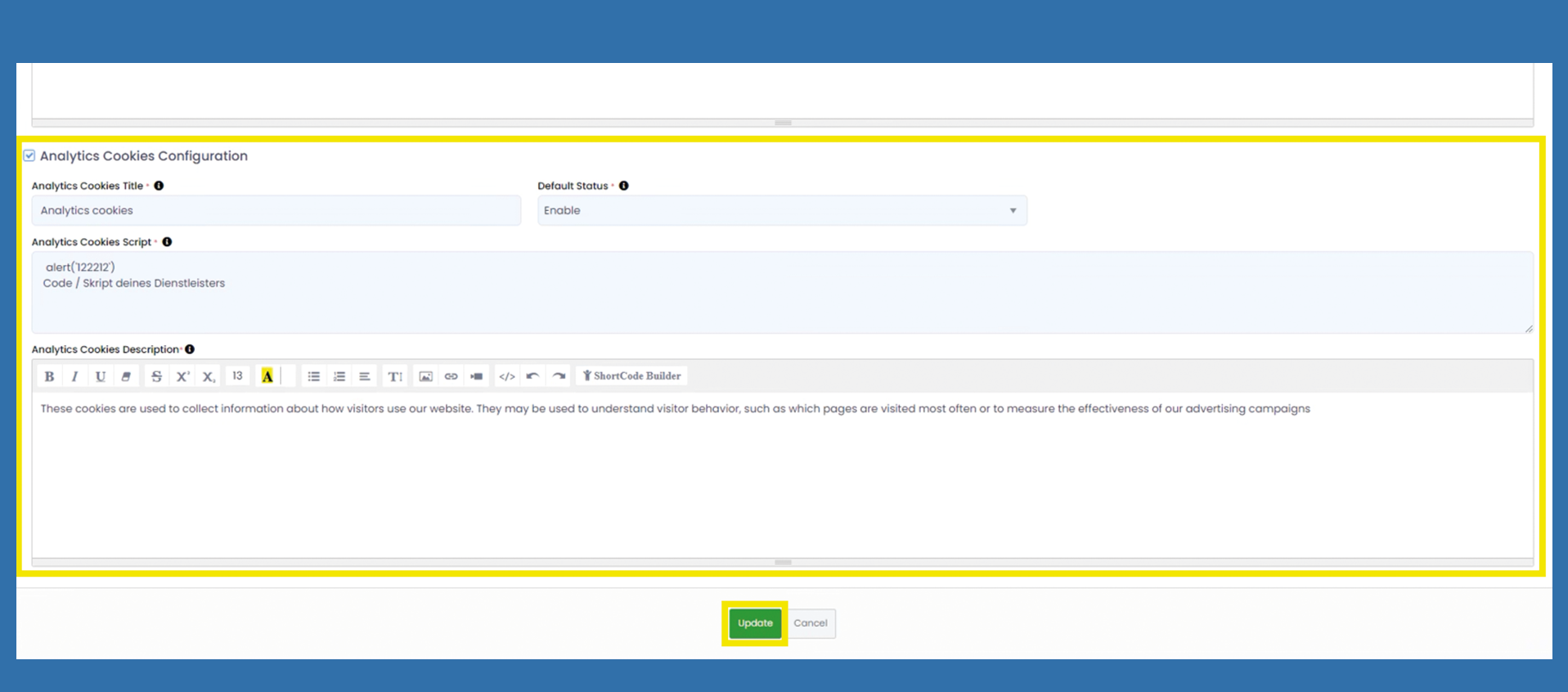 Choose the Default Status to Enable or Disable this area in the cookie banner via dropdown. After you chose Enable a new field named Analytics Cookies Script opens.