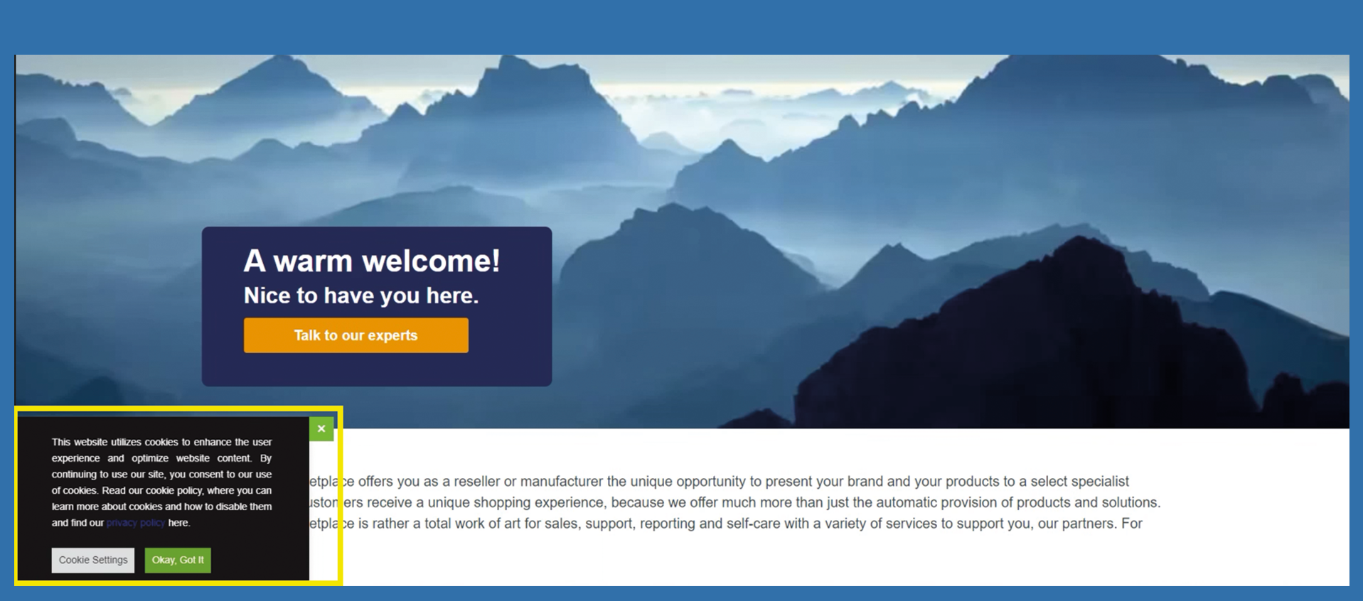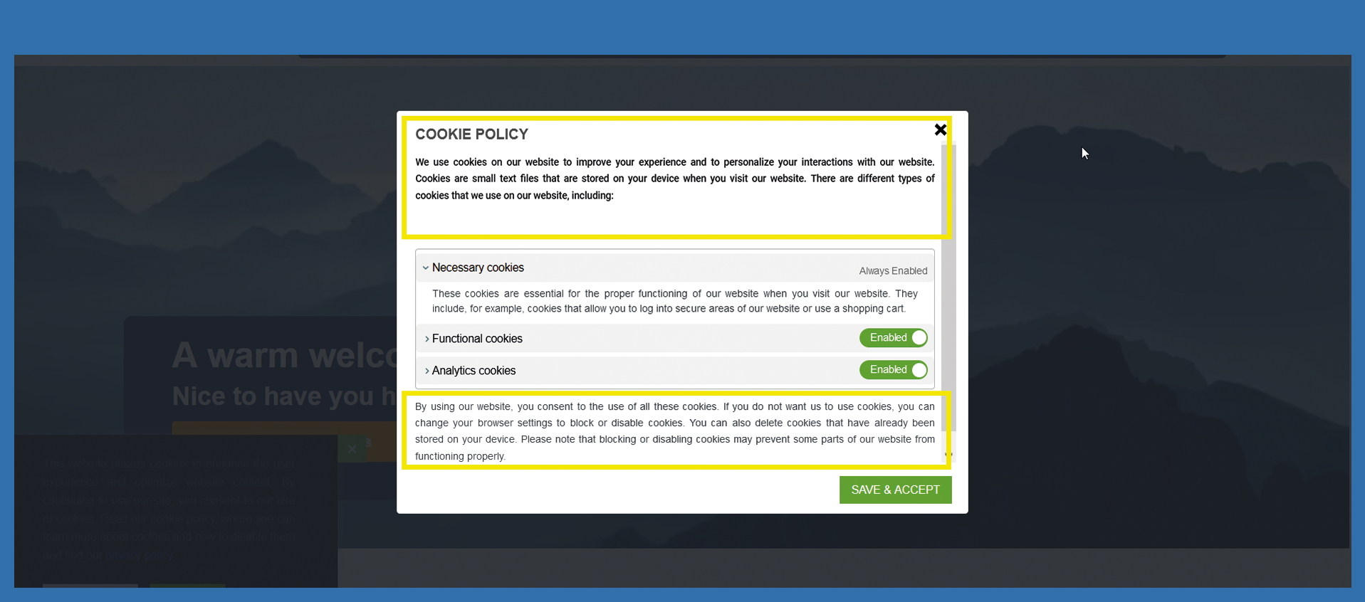 In the following description we show you sample texts and where exactly they are displayed in the cookie banner on your homepage.