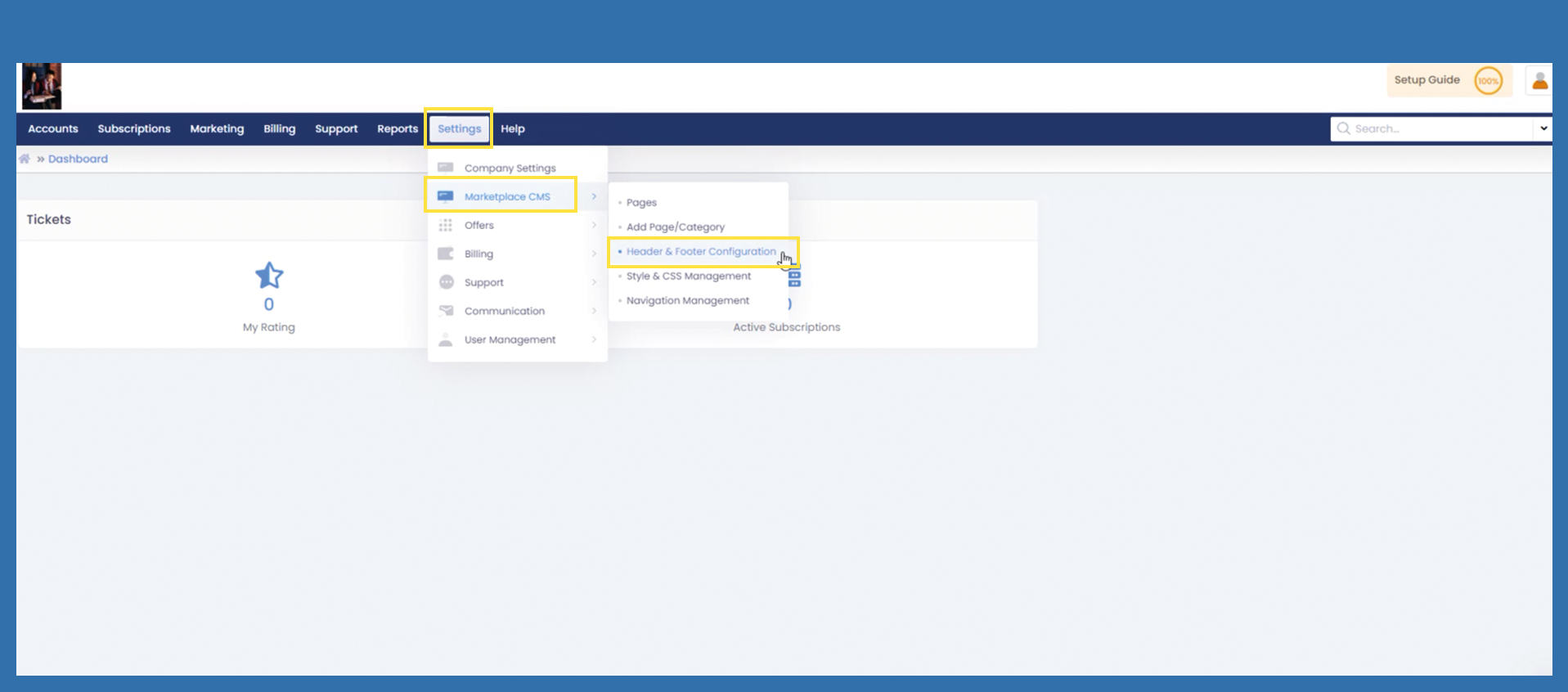 Settings > Marketplace CMS > Header & Footer Configuration