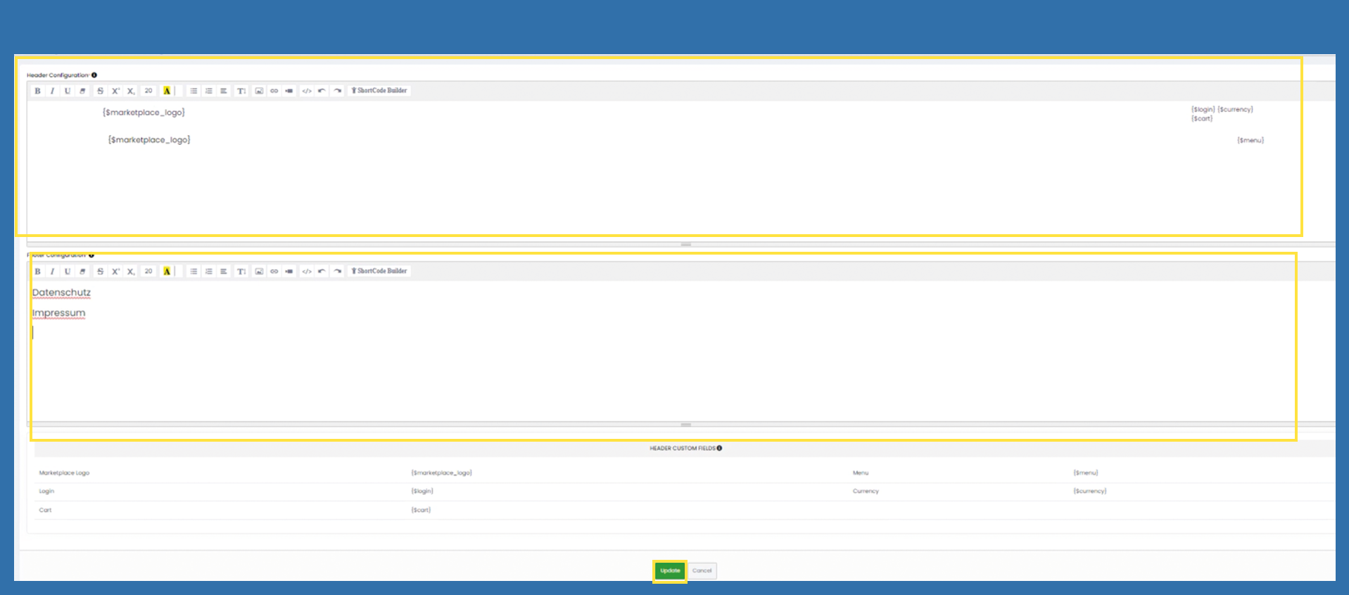 Header Configuration: Use the variables at the bottom of the page to position them as you wish. They will then be displayed on your marketplace. Use HTML if you can handle it.