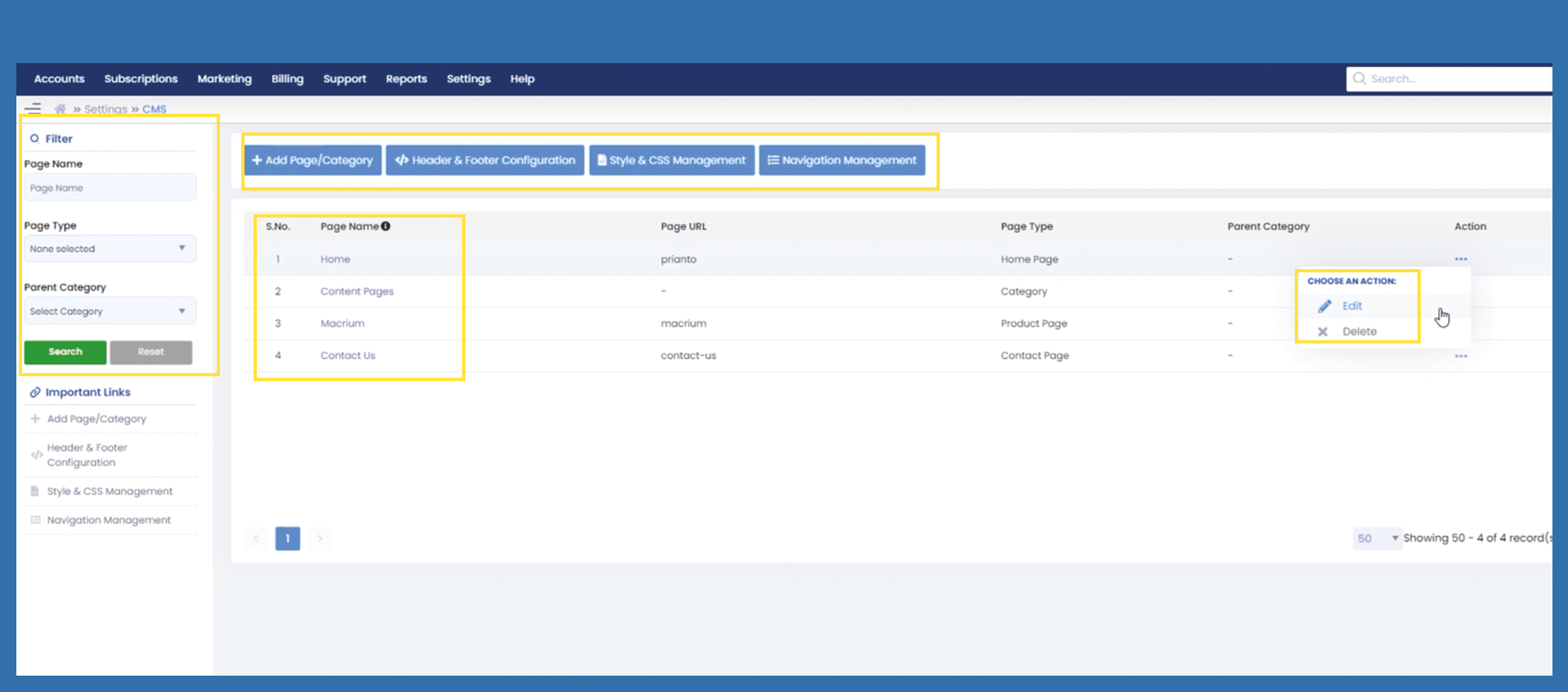 Here you can see an overview of all the pages you have created. From here, you can edit pages you have already created by clicking on the three dots on the right-hand side under Action and then on Edit.