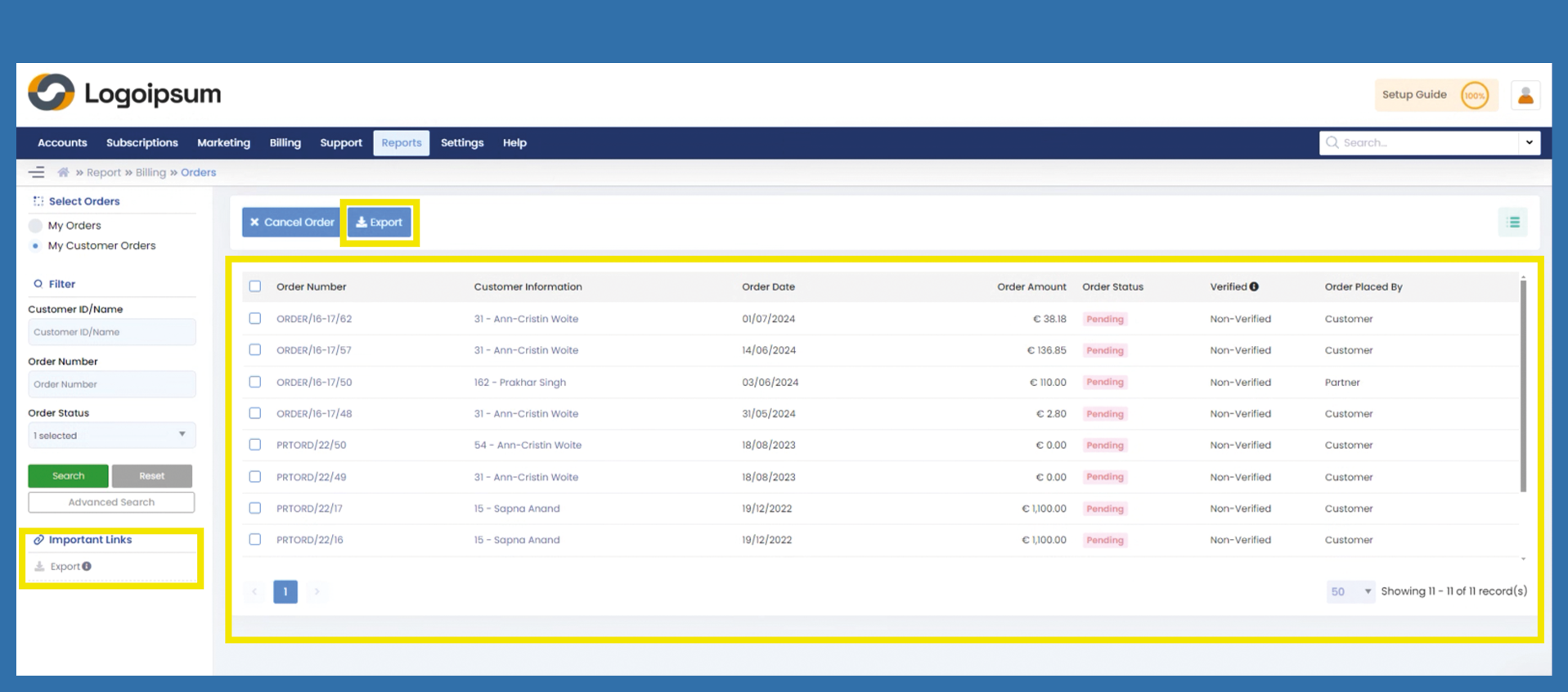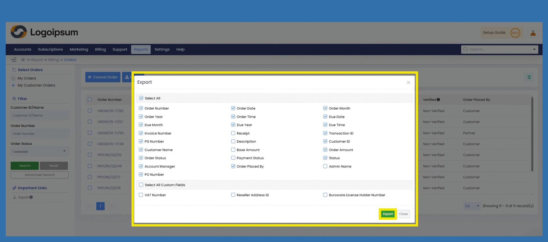 A popup opens, from here you can select which data you would like to have displayed in addition to your orders.