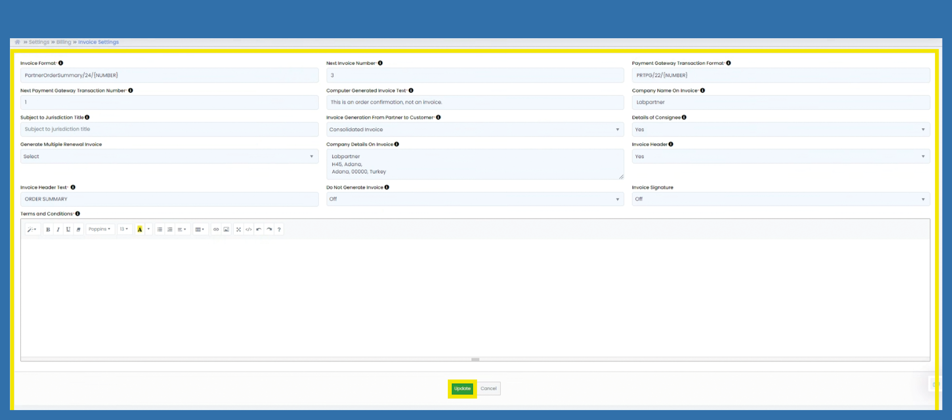 Company Details On Invoice: Enter your company name and address here. This will be displayed accordingly in the order summary.
