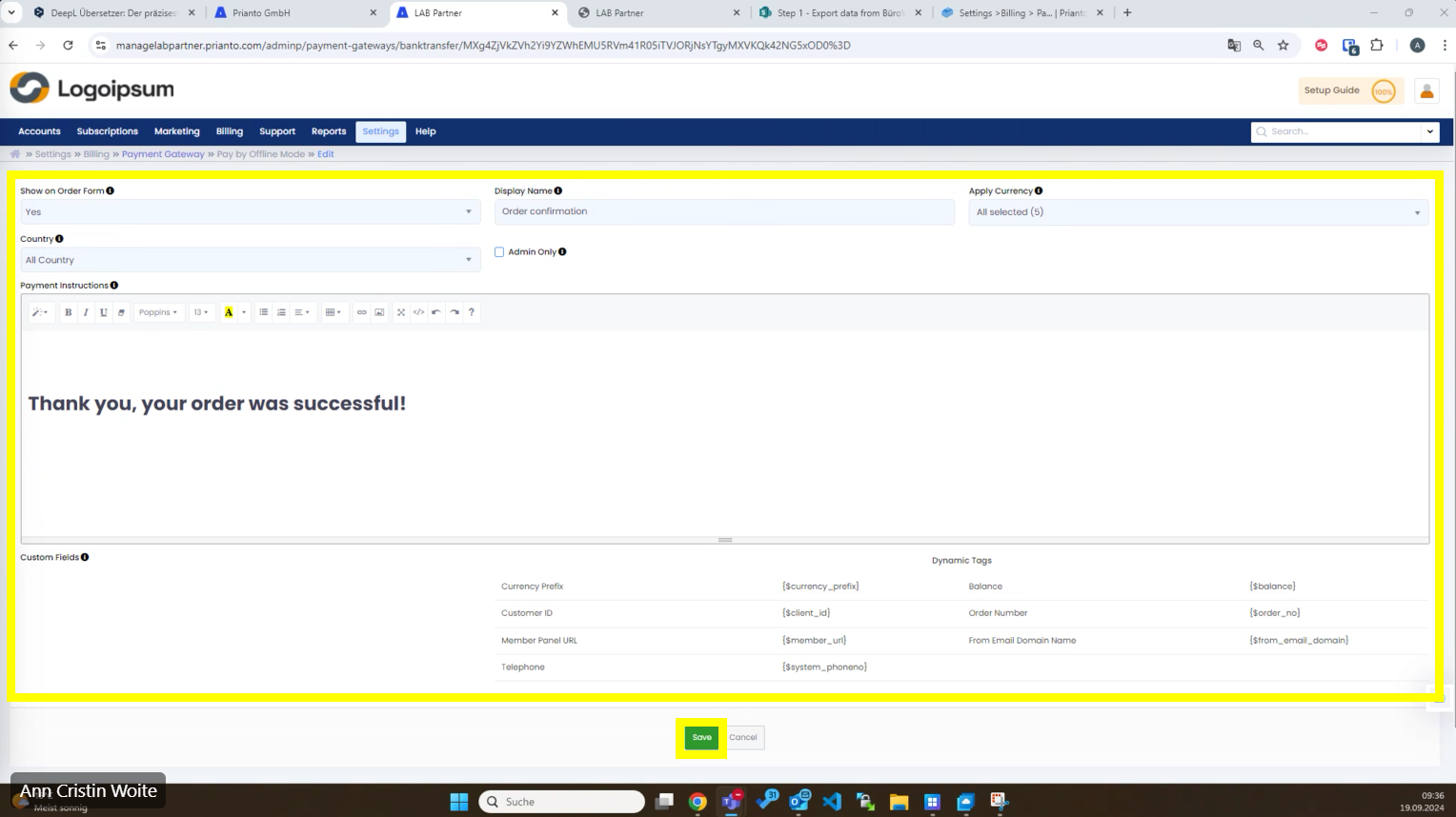 Use the following setting to offer your end customers certain payment methods. In the Getting Started Wizard we have already set the basic settings for the simple bank transfer.