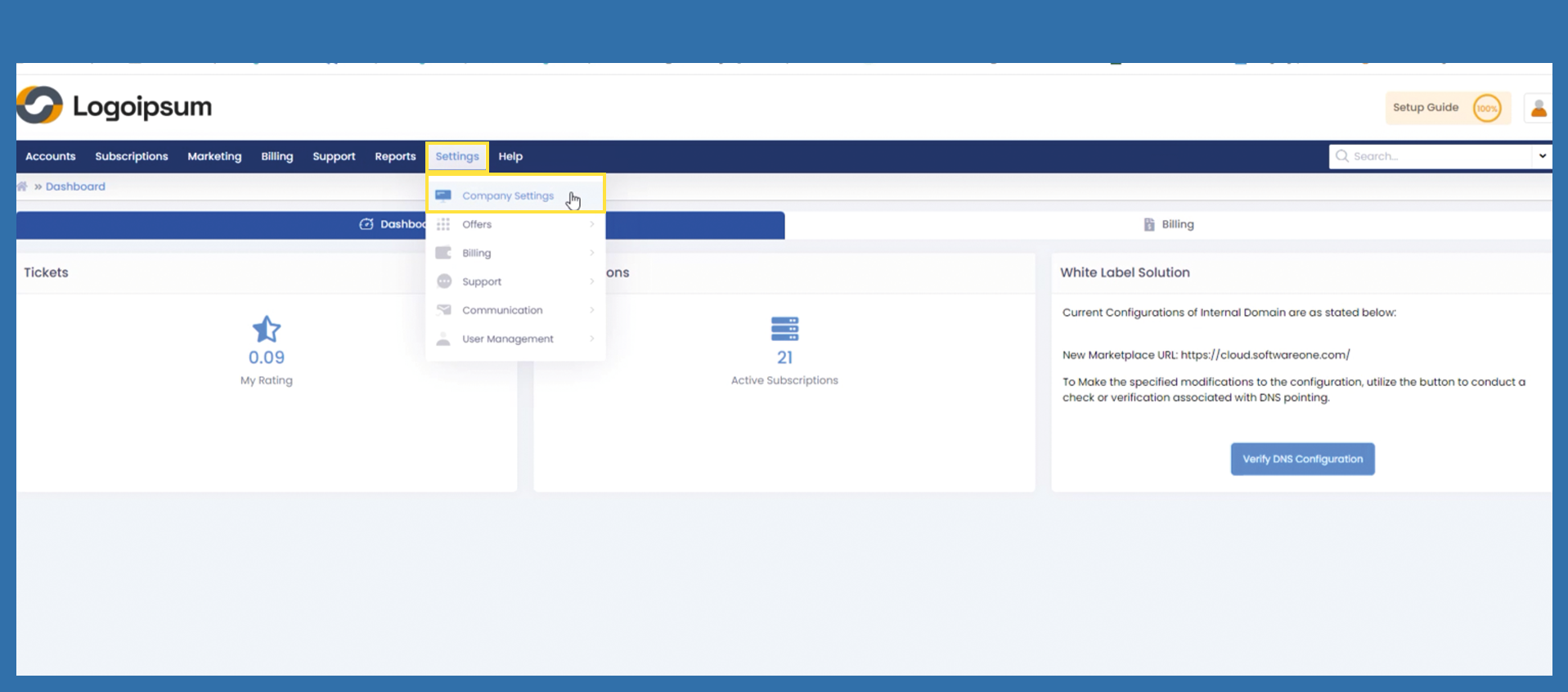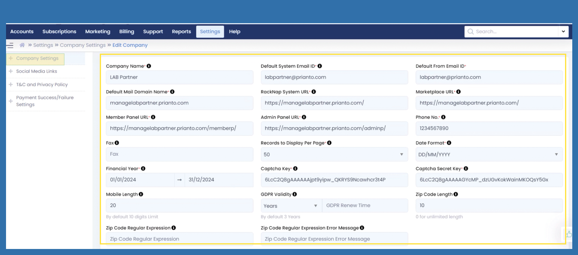 The fields Company Name, Default System Email ID, Default From Email ID and Default Mail Domain Name are automatically entered here from the Getting Started Wizard. You can change this data manually.