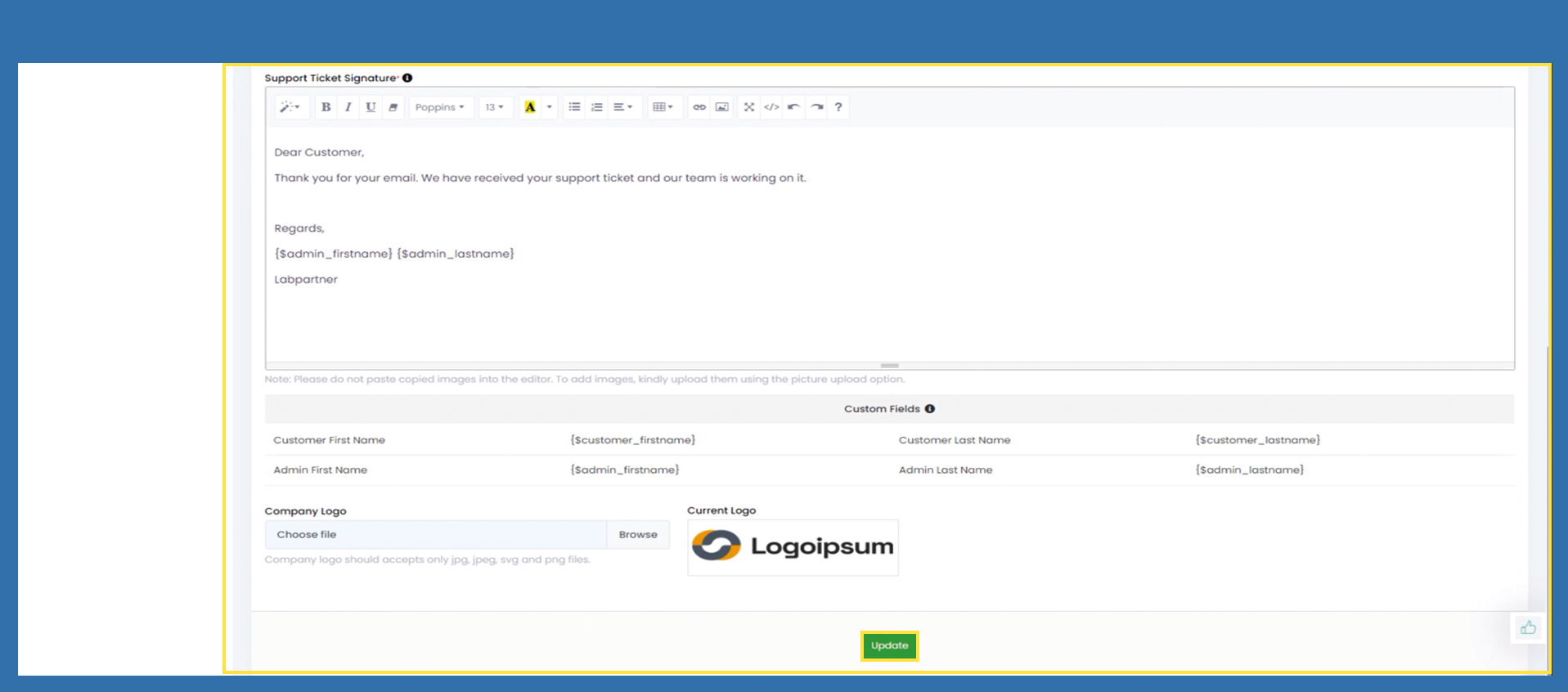 Under the Support Ticket Signature field, enter the signature that is to be mirrored in the support tickets.