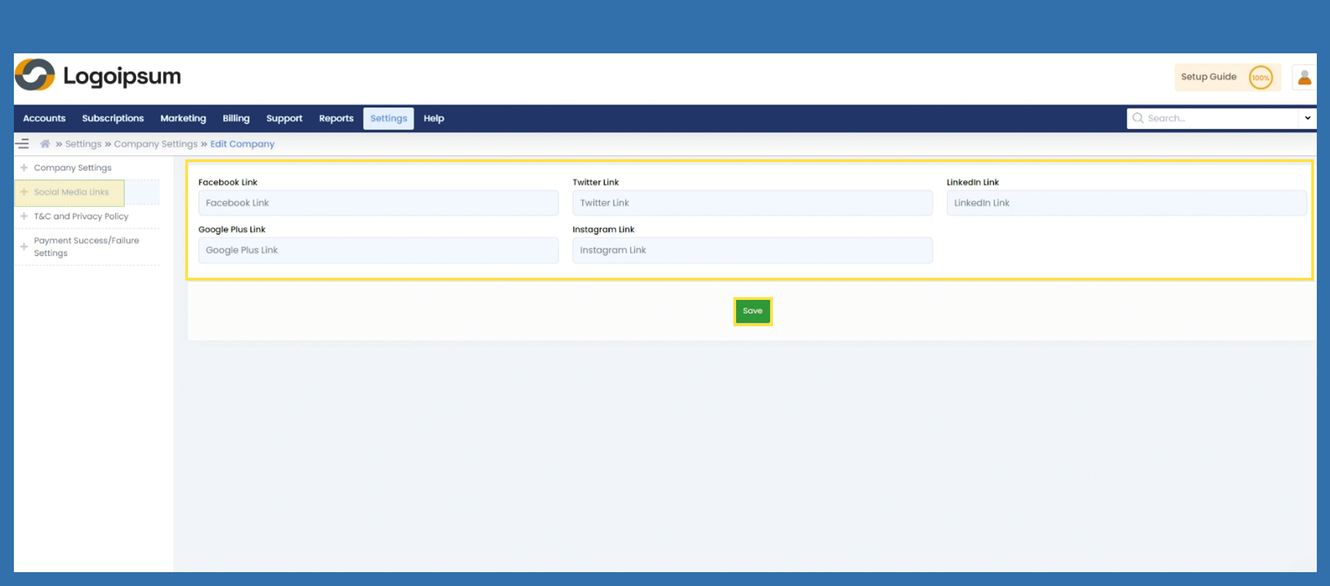 Choose on the left-hand side the tab +Social Media Links. Enter the links to your profiles and click on Save.
