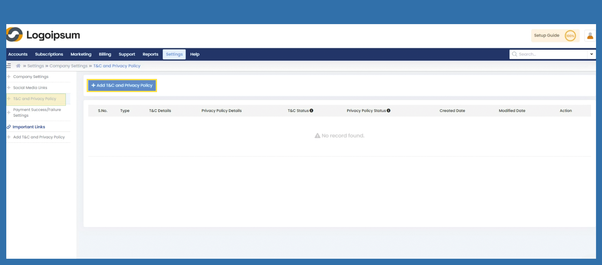 Choose on the left-hand side the tab +T&C and Privacy Policy. To deposit the privacy policy click on +Add T&C and Privacy Policy.