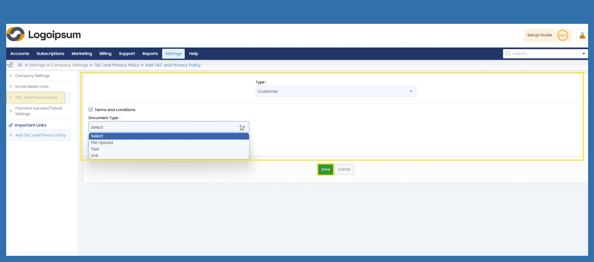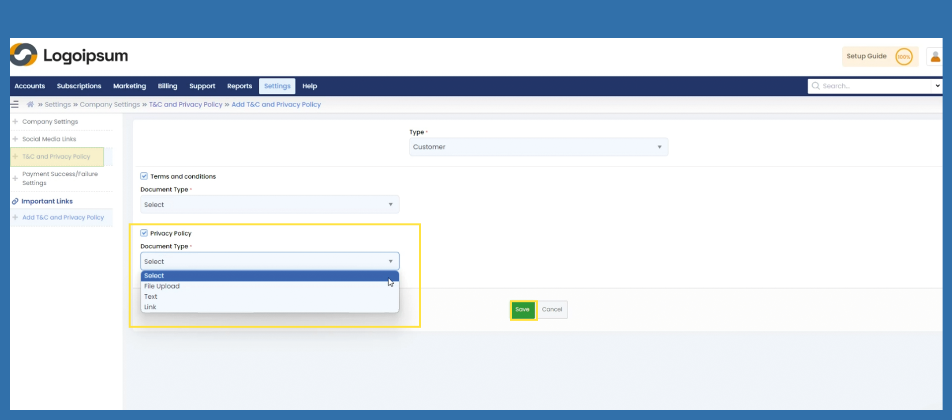 Check the Privacy Policy box and select in the Document Type via dropdown how you want to bring your Privacy Policy into the system. Click on Save.