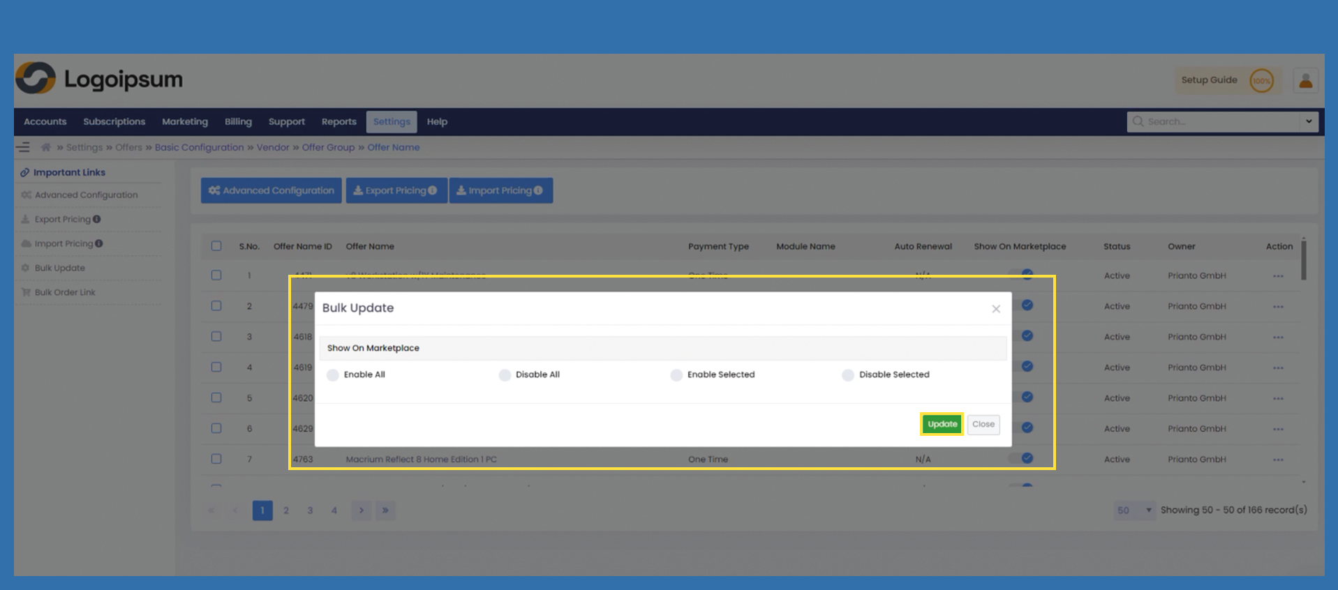 Disable Selected - Select the desired items here and place a check mark in the overview. Then click on Bulk Update and then on Disable Selected to disable these items on your Marketplace.