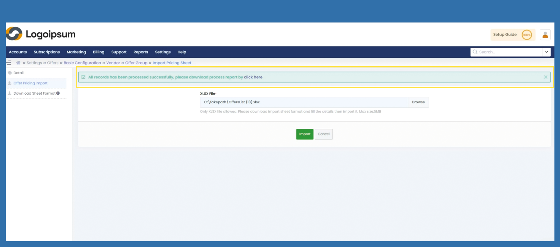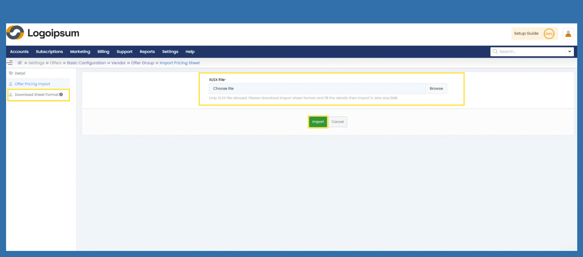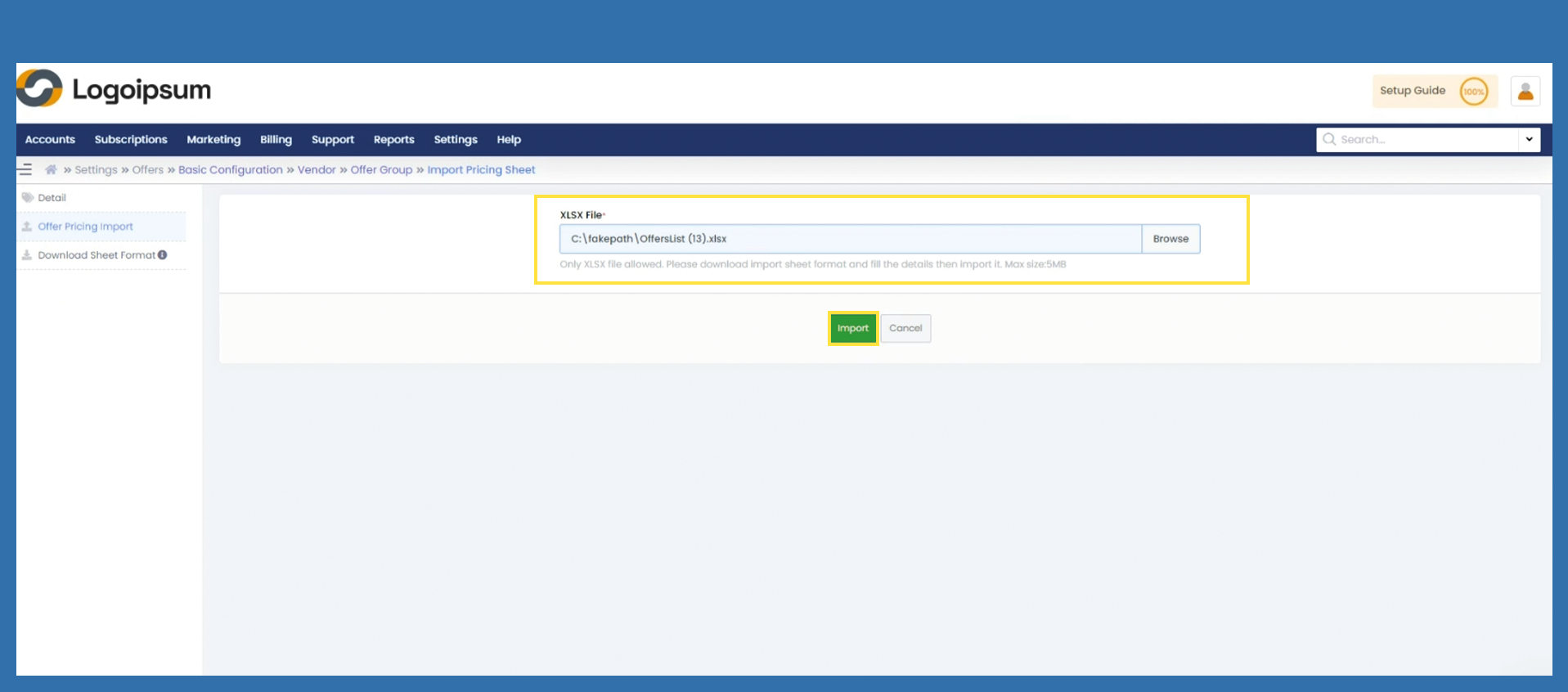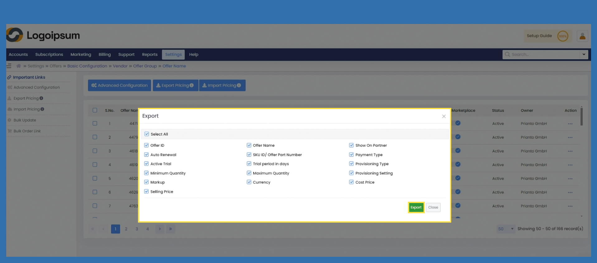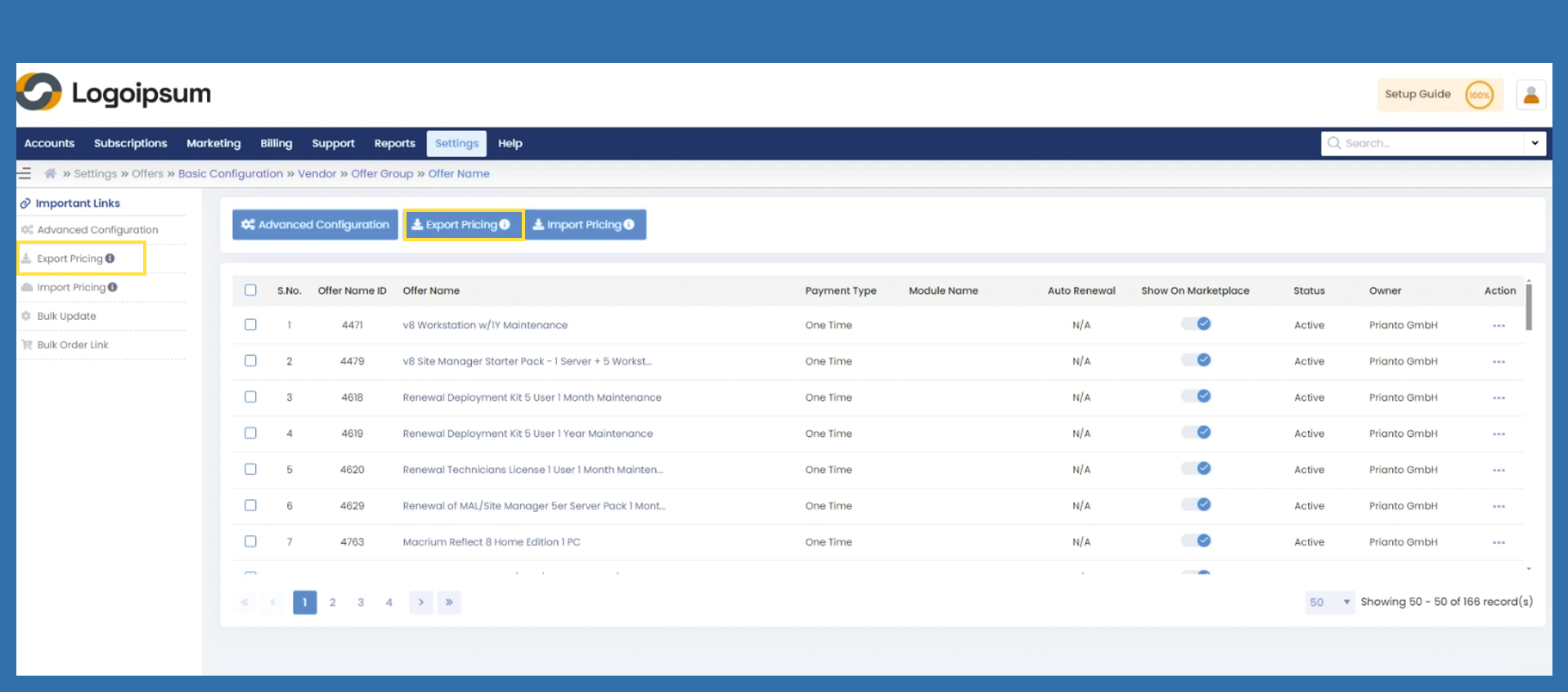 Settings >Offers > Basic Configuration > Offer Group > Offer Name > Export & Import Pricing