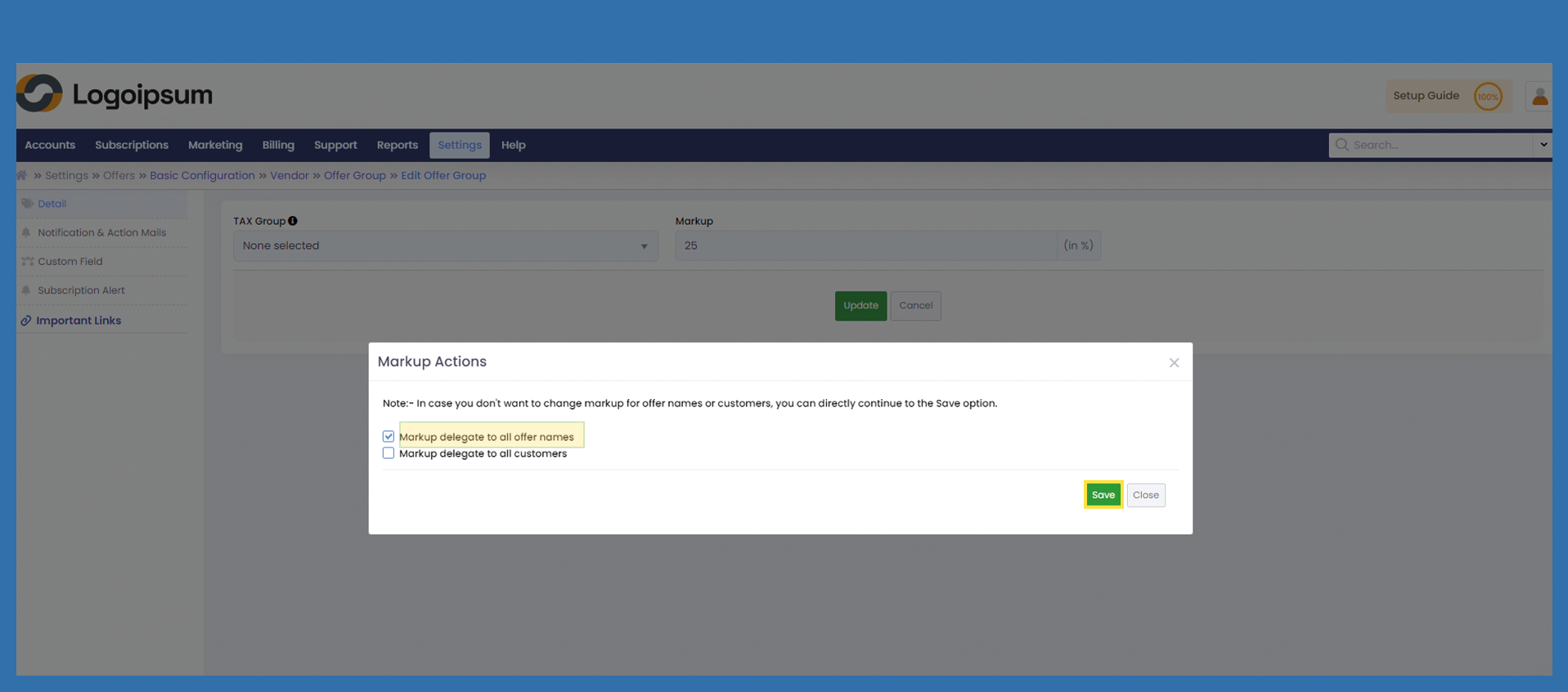 Select here for the time being: Markup delegate to all offer names and click on Save