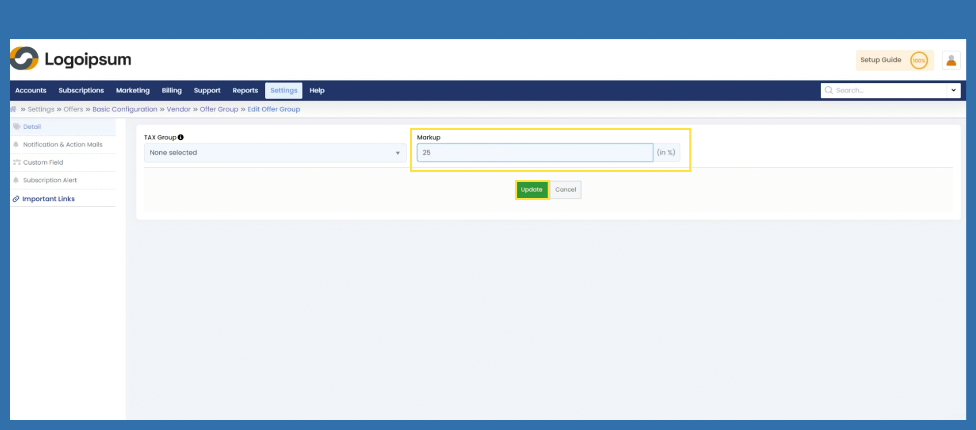 Under Markup, enter the corresponding percentage that applies to your purchase price and click on Update to save data.