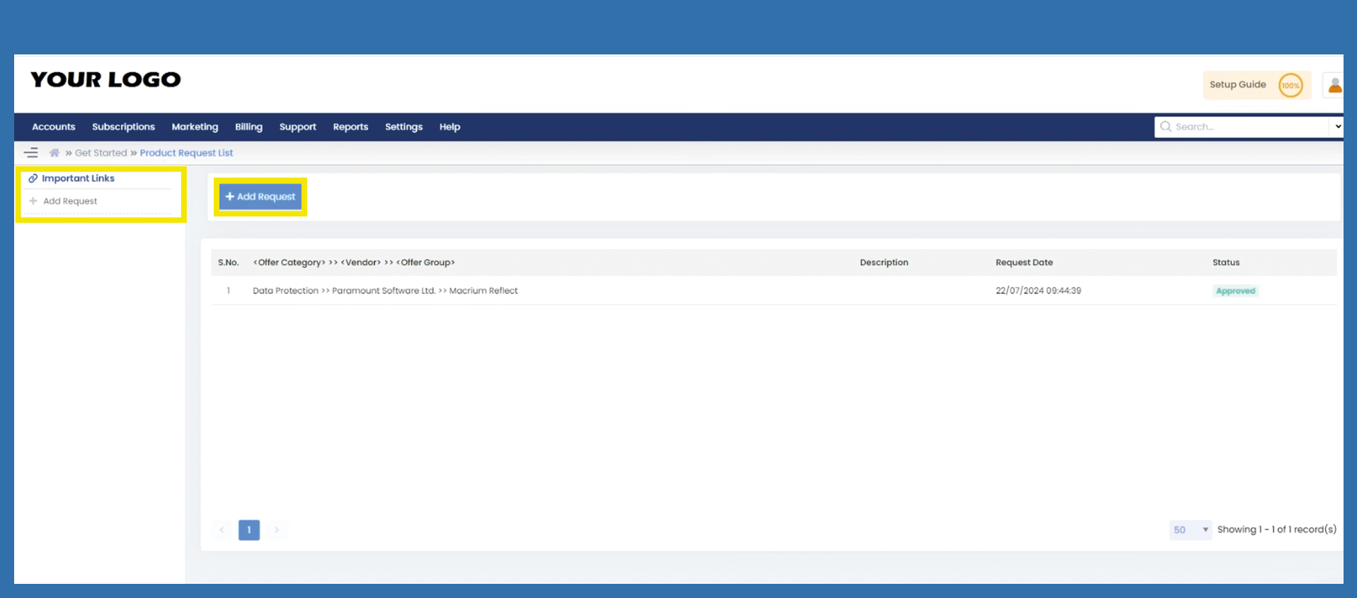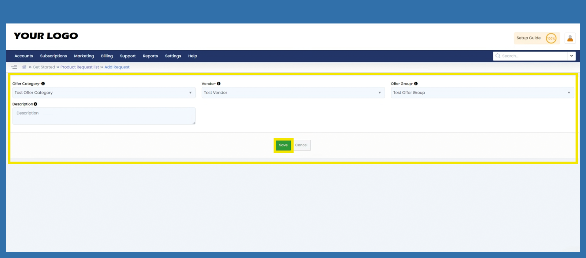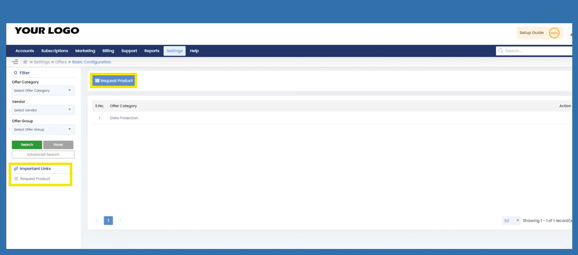 Settings > Offers > Basic Configuration > Request Product