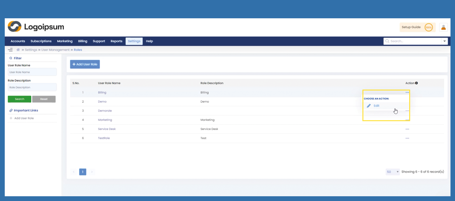 To find a role you can use the filter section on the left. To add a new role, click under Imports links or on the blue +Add User Role button.