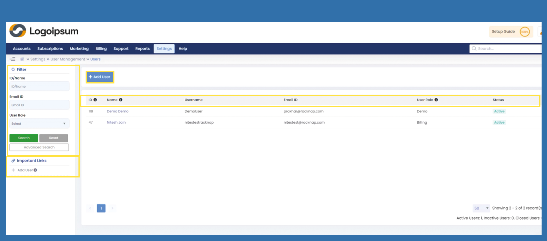 In the overview you will find the Name, the Username, the Email ID as well as the assigned role and the Status, whether your subuser is active or inactive. If you have already created several users, you can use the Filter Section on the left-hand side to select the desired user. You can add new users both under Important Links and with the blue +Add User button.