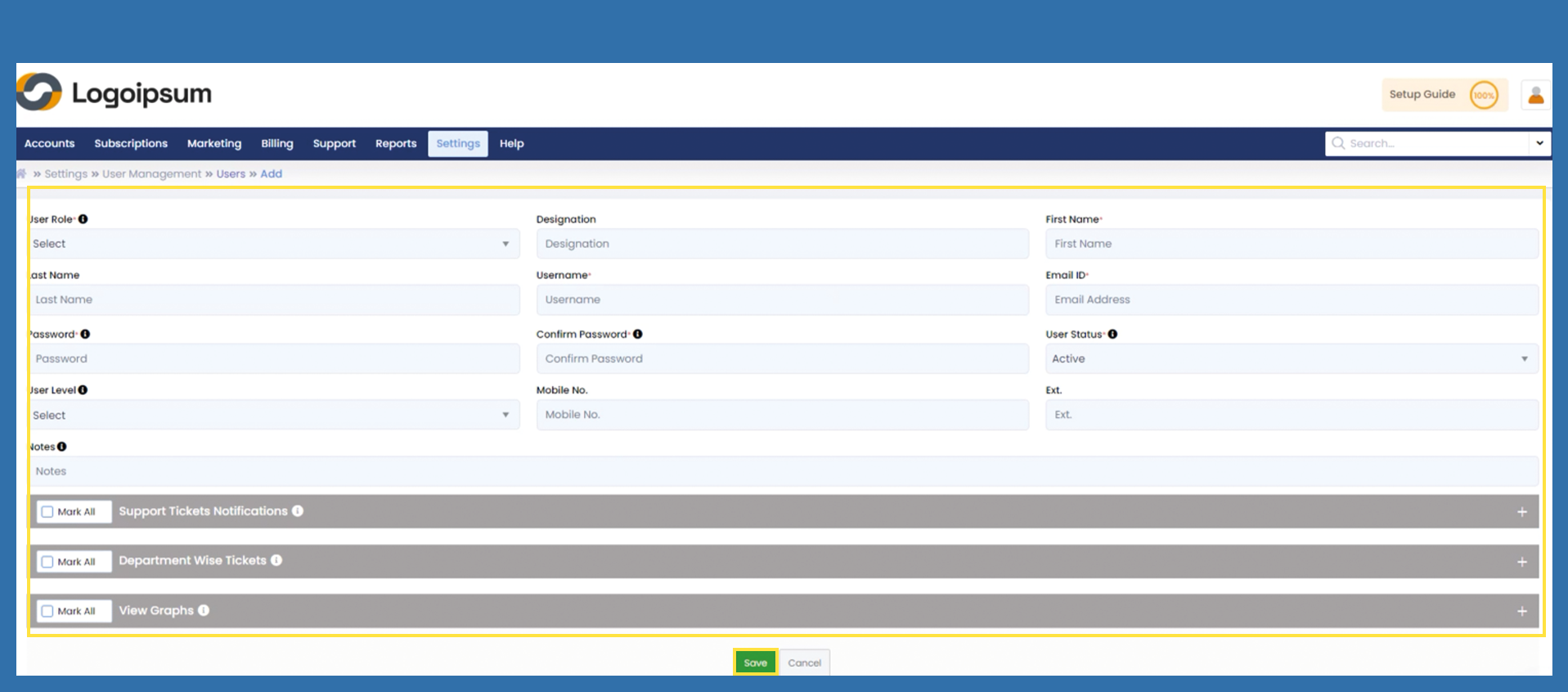 Department Wise Tickets : Here you have the option to access further rights for the user aside from the already enabled rights of the Role. For example: You have created a new department for better ticket support under the following path. Settings > Support > Ticket Department. To make the newly created department visible, the check mark must be set under all users who are assigned to the new department.