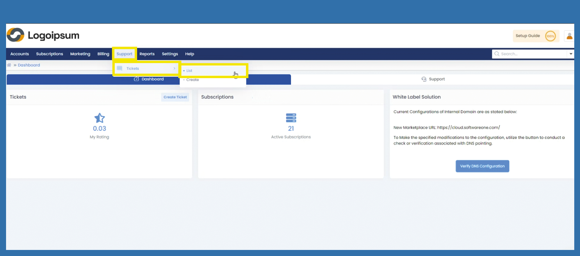 Support > Tickets > List