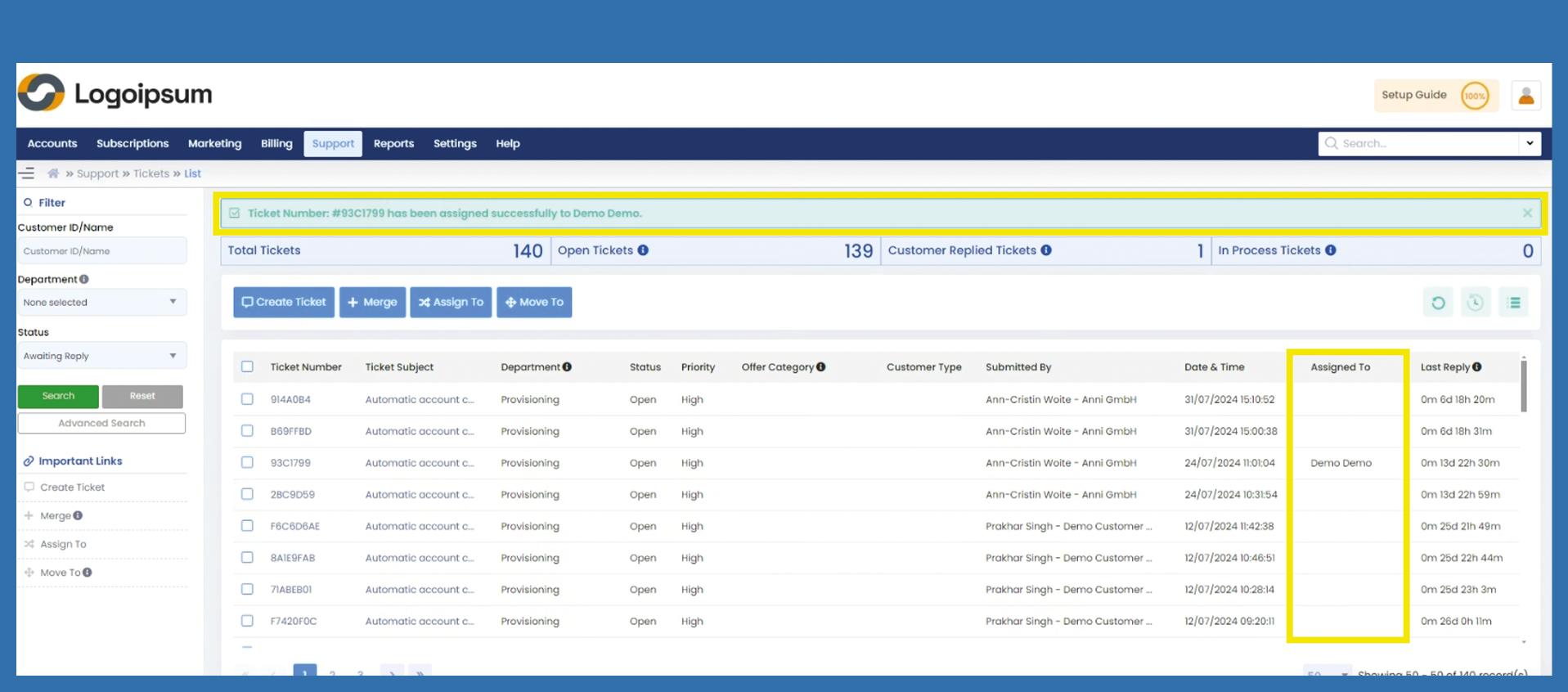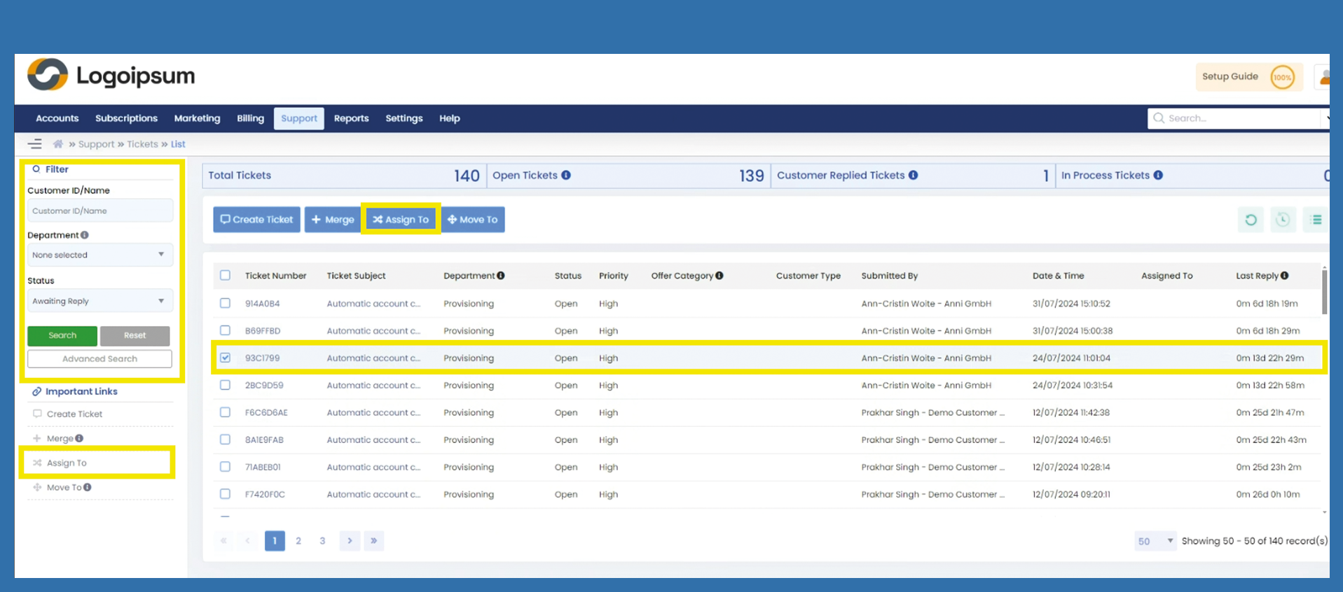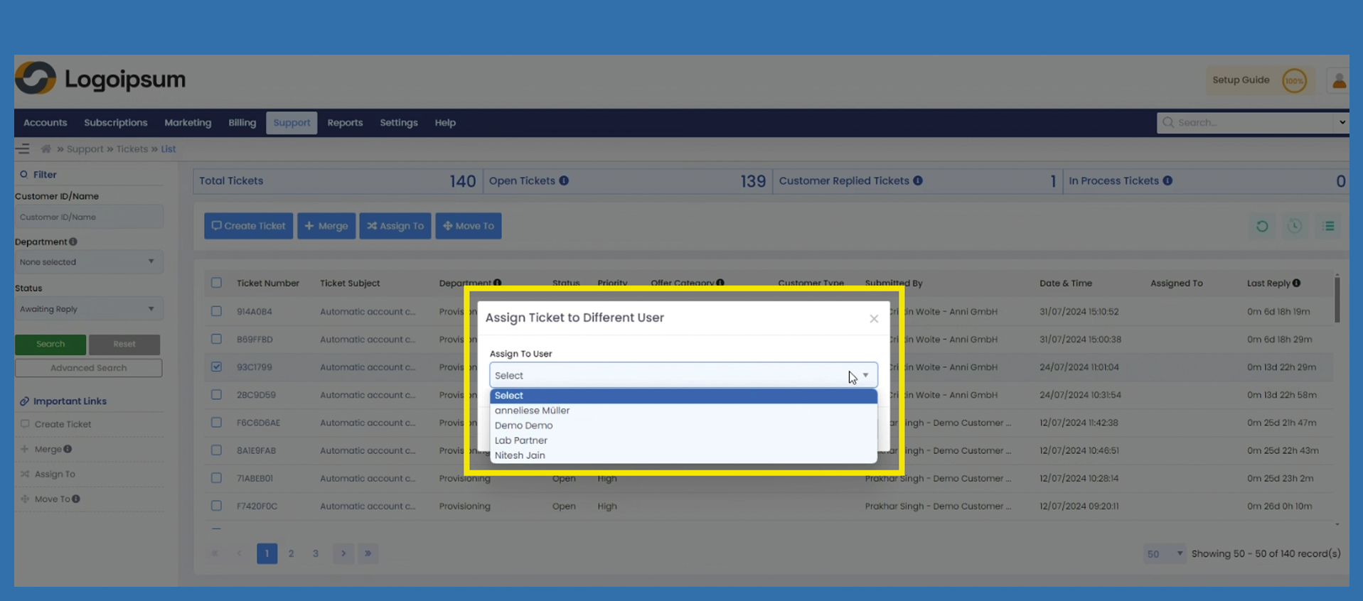 Support > Tickets > Assign ticket to a person