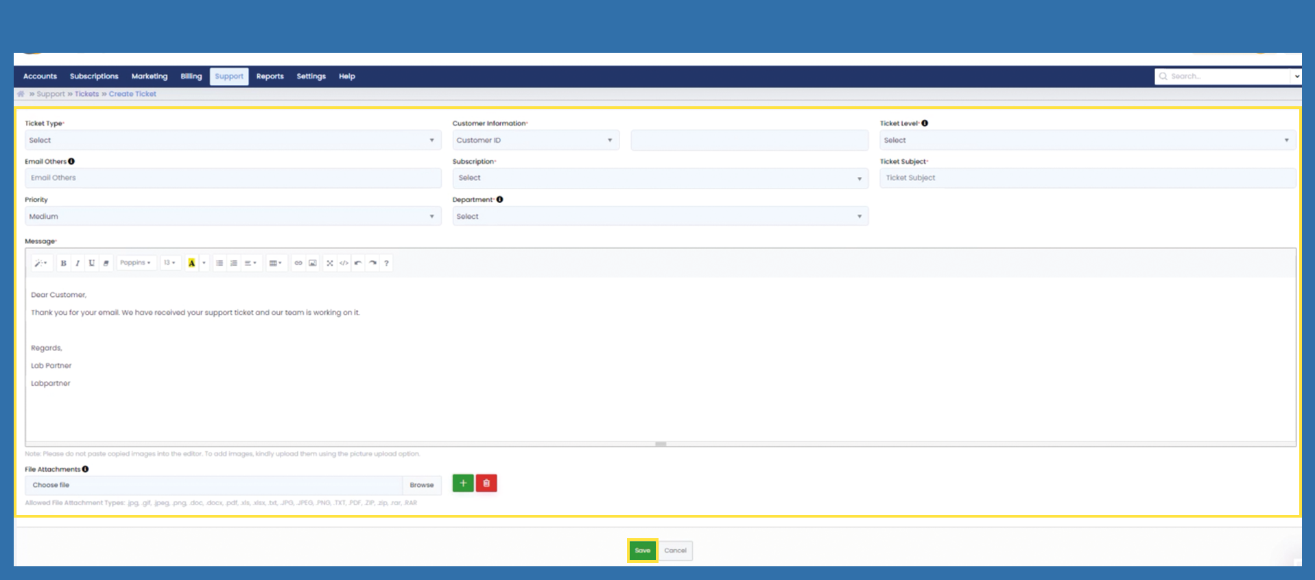 Ticket Type: Select the reason why you want to create a ticket, so the support can identify the problem quick and easy.